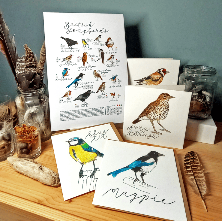 In 2024 I took part in an illustration challenge to draw a British Songbird every day throughout the month of February, in support of the charity Songbird Survival. I had such an amazing time illustrating birds and finding out more about them and their Conservation Status (how endangered a species is), that I wanted to take some of the illustrations and create a collection. My British Songbirds collection includes an A4 art print, a tea towel, a selection of square note cards and some wooden coasters. All of the products are eco-friendly and made in the UK and I deliver everything plastic-free.