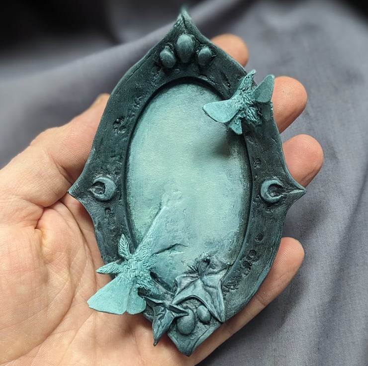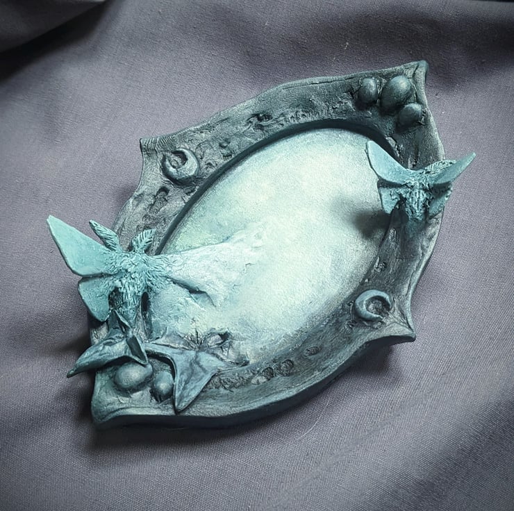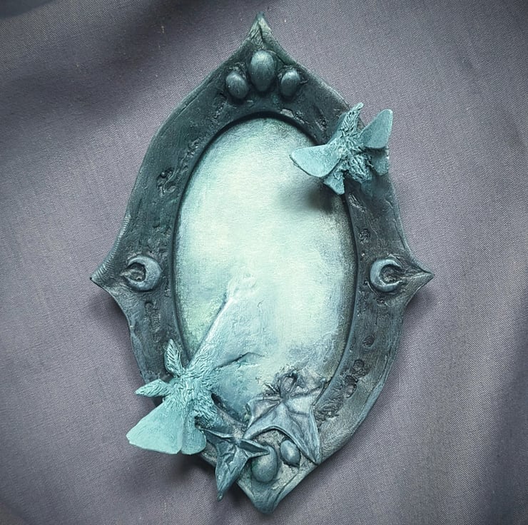 The symbolism of mirrors is an interesting idea to play with, although it doesn't have an actual mirror plate in, the surface of the mirror is meant to offer up the idea that mirrors are gateways to an unseen world. With in the Pale House they are small doorways where moths, ivy and flowers burst forth, bathed in a gentle glow, akin to moon light.