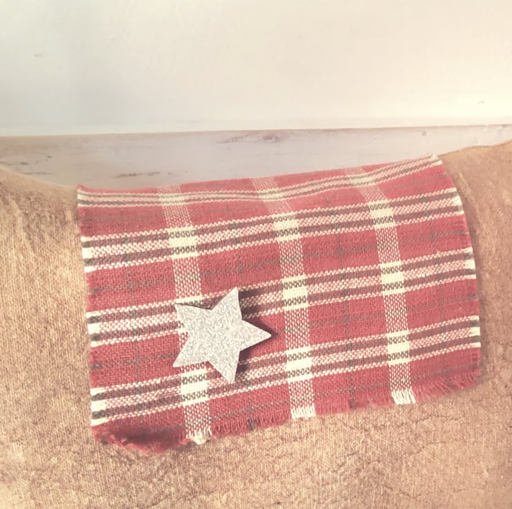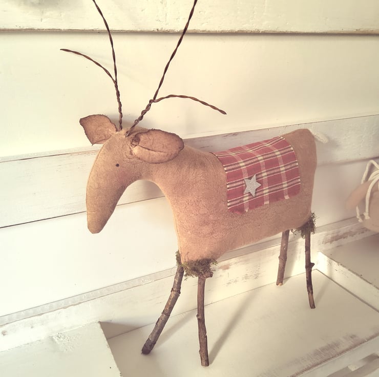 This dear reindeer is made from coffee and cinnamon dyed calico ,sanded for a vintage look. He has twig legs the tops of which have a little bit of sphagnum moss attached. The antlers are twisted rusty wire and the tail is fluffy cotton fabric. Reindeer wears a homespun fabric blanket trimmed with a wooden glittery star.