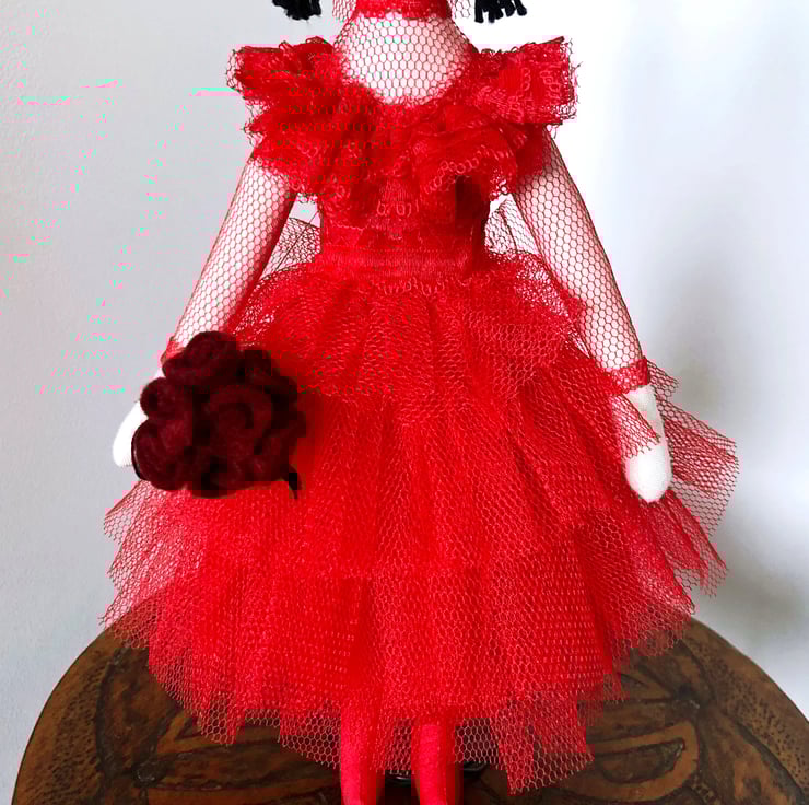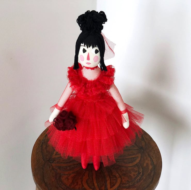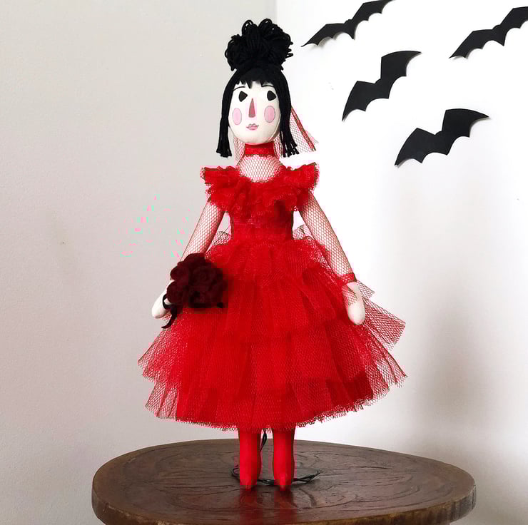 Handmade art doll inspired by the character of Lydia Deetz from the movie Beetlejuice in her red wedding gown.