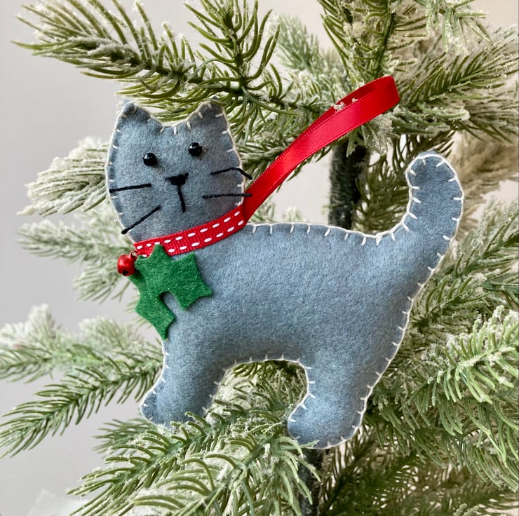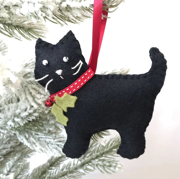 Sweet little cat decoration, hand-sewn in black felt with bead eyes and whiskers, a smart red collar, little tinkly bell 'berry' and holly leaves.