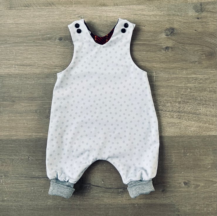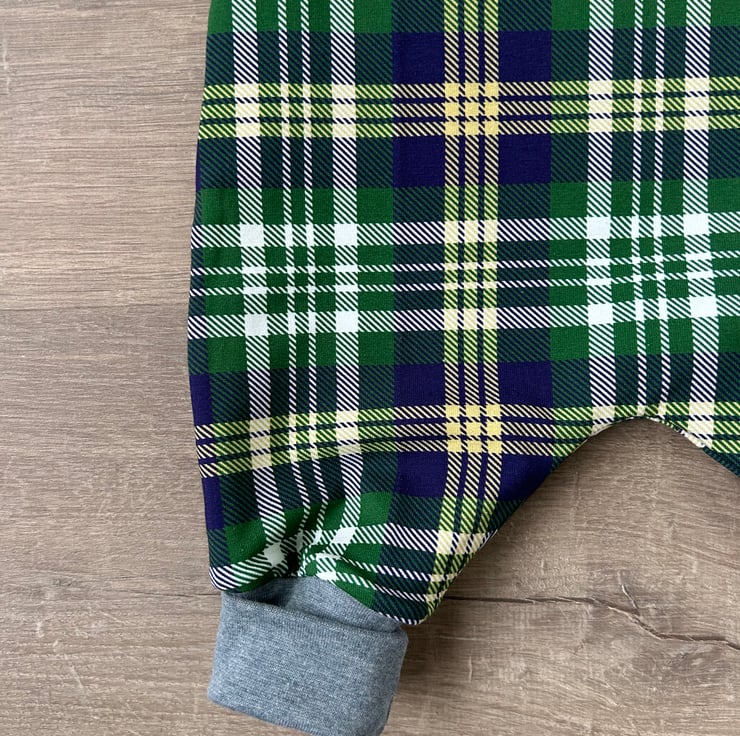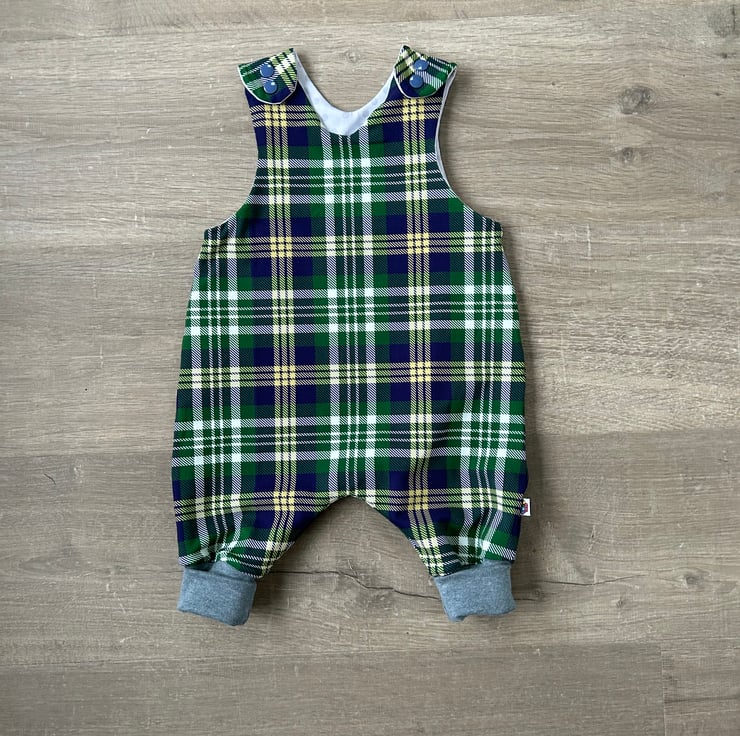 Reversible, comfy, stretchy Green/Blue Tartan cotton romper with a light grey spotty fabric on the reverse. A perfect little Christmas/New Year outfit for your baby that can be reversed and used again after the festive period is over. Matching cuffed legging, skirts and Kick flare trousers are available to order too while fabric stocks last. Please contact me to order.