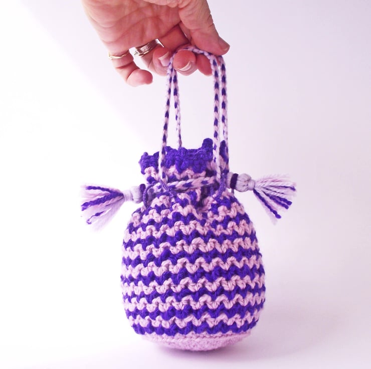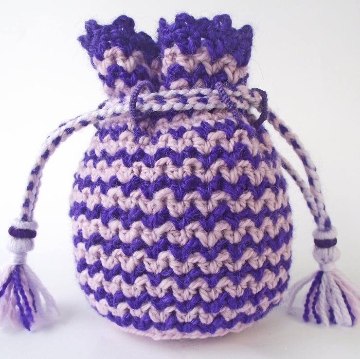 Drawstring Bag or Pouch with Tassels, Crochet Bag, Purple and Lilac Merino