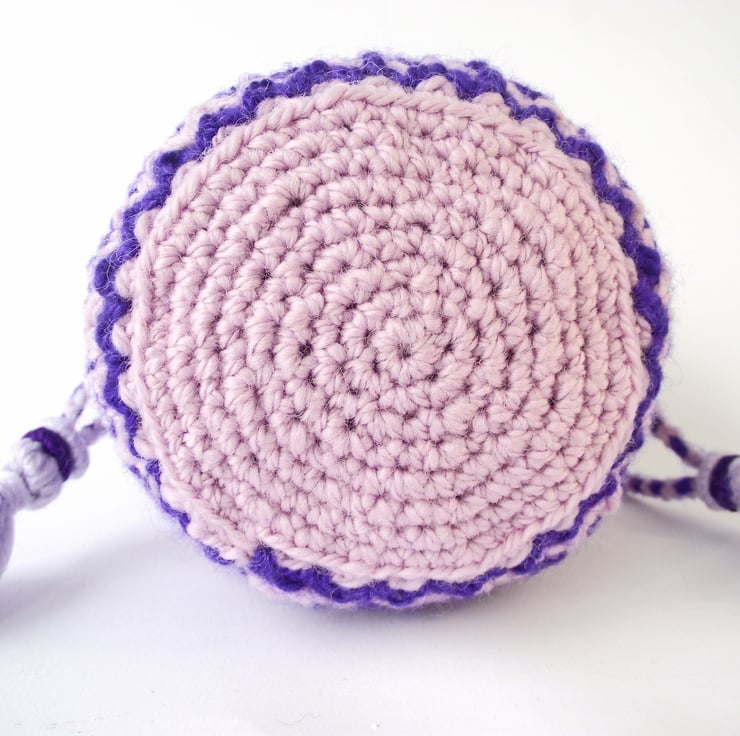 I handspun some purple and some lilac (paler purple) merino wool then I crocheted this cute drawstring bag. The drawstrings are braids I made using the 'loop exchange' technique and they are threaded through couronne rings which I made from durable crochet cotton, on the exterior of the bag. This is a better way of using drawstrings because threading drawstrings through a bag can cause wear. I added Peruvian tassels to the braids.