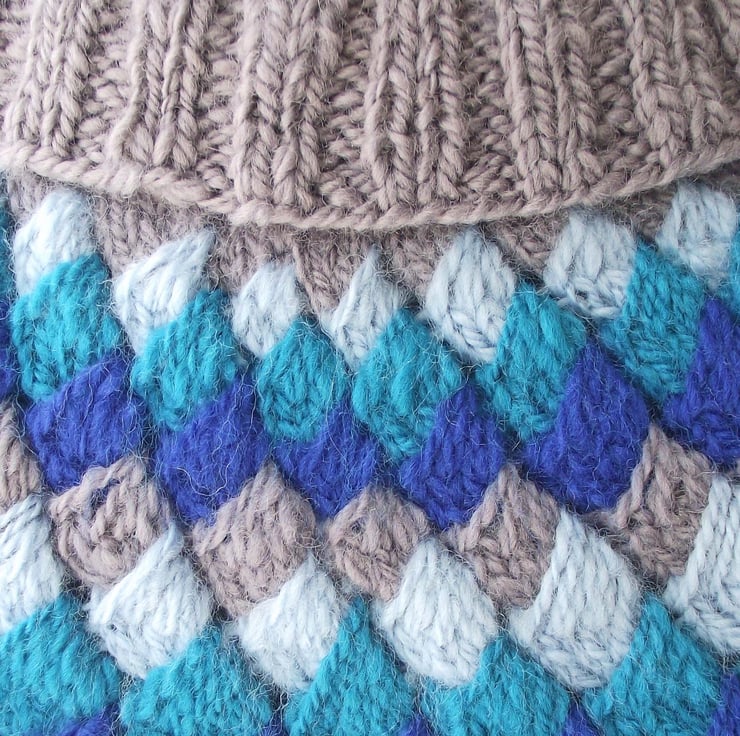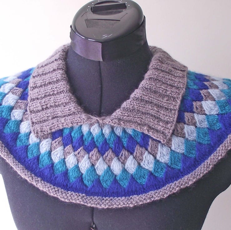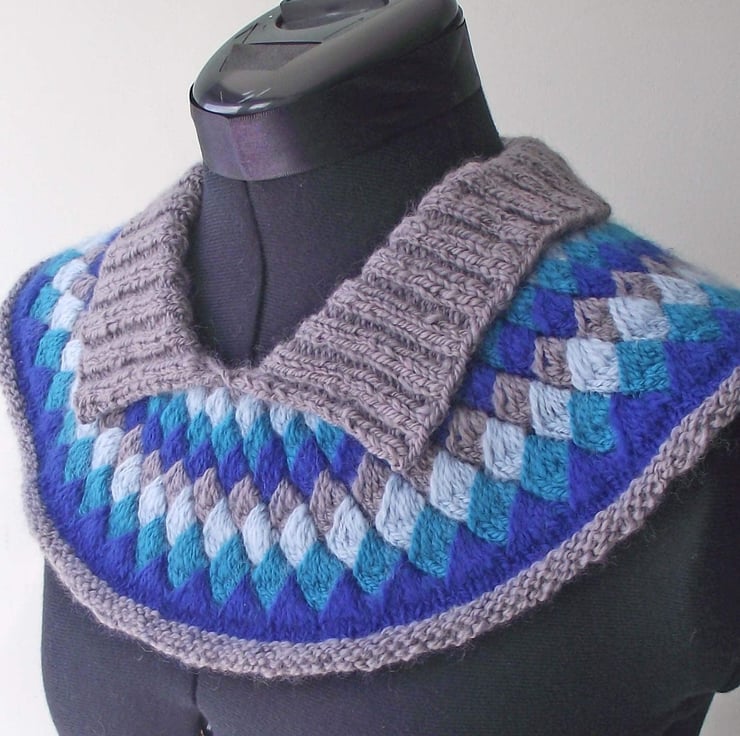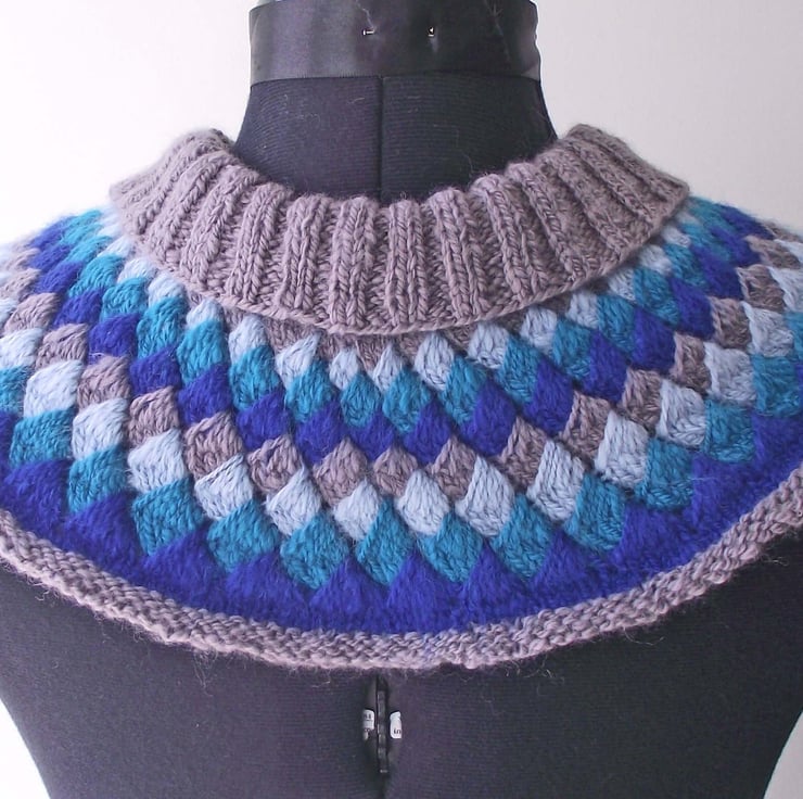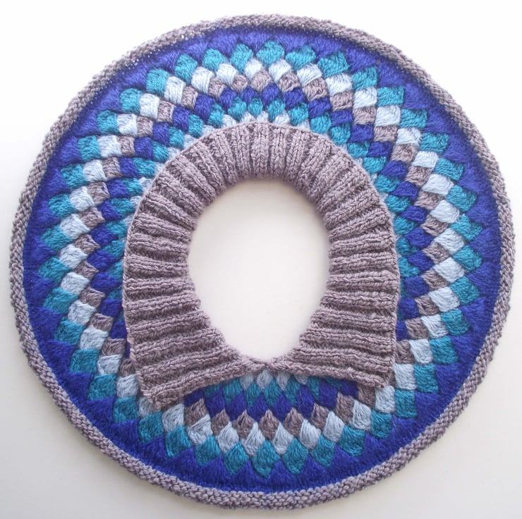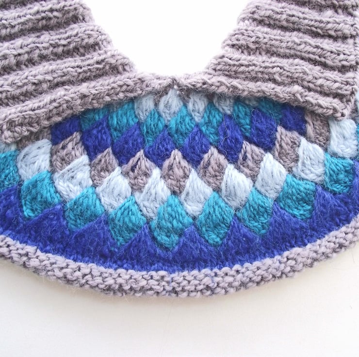 This collar, cowl or neckwarmer is my own design, knitted from my own handspun, supersoft 100% merino wool yarn. The main colour is a mid grey and the textured stitch is knitted in pale blue, turquoise and ultramarine blue. Very eye-catching!