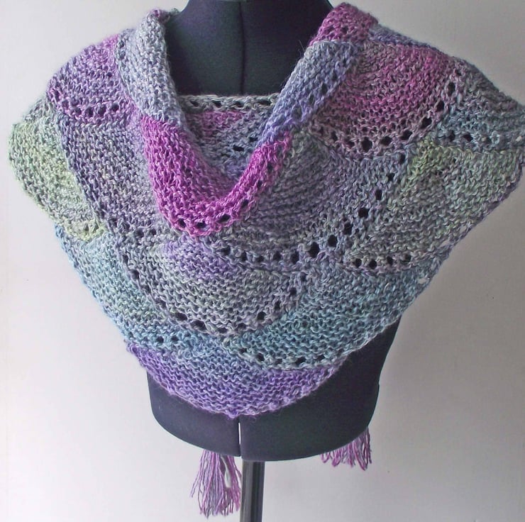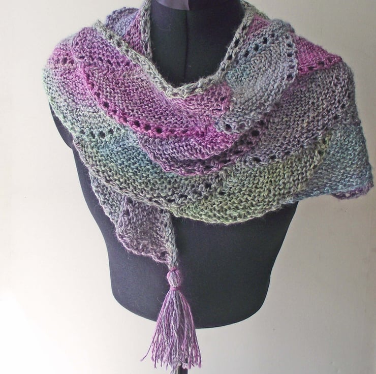 I handspun a wonderful blend of llama, white-faced woodland wool, ramie and bamboo, which had been hand painted by yummyfiberarts, in soft shades of pink, blue, and green. I then knitted this shawl using a modular scallop technique, to my own design, including eyelets for an added lighter feel. I also added tassels, adding length and weight, which helps the ends stay in place.