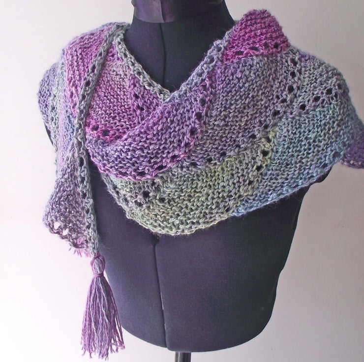 This shawl is very versatile and can be worn many ways. Please see all the photos. I think this would look stunning with a dress on a special occasion, or it would also look great with jeans and a jumper or jacket. It would also be a lovely shoulder warmer either for watching TV or for reading in bed.