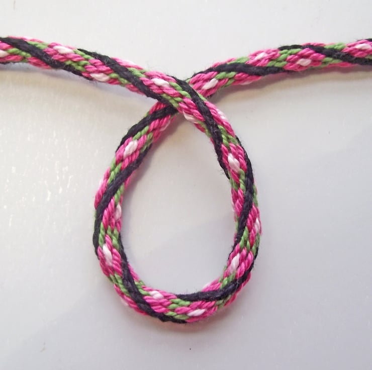 I then made a braid using pink, green and black cotton thread using the Japanese Kumihimo technique. I have used nickel-free silver plated jewellery findings to connect all the elements of the necklace, including the lobster clasp and the pendant bail.