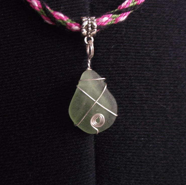 A unique piece! I wrapped a piece of green sea glass which was found on a Guernsey beach with silver toned wire, making it into a unique pendant.