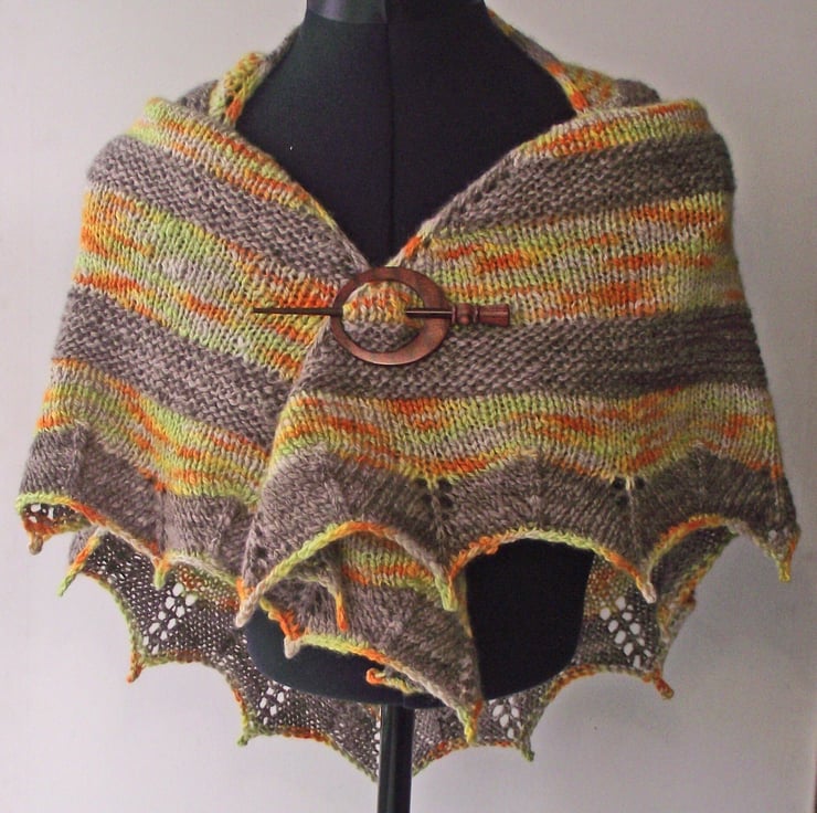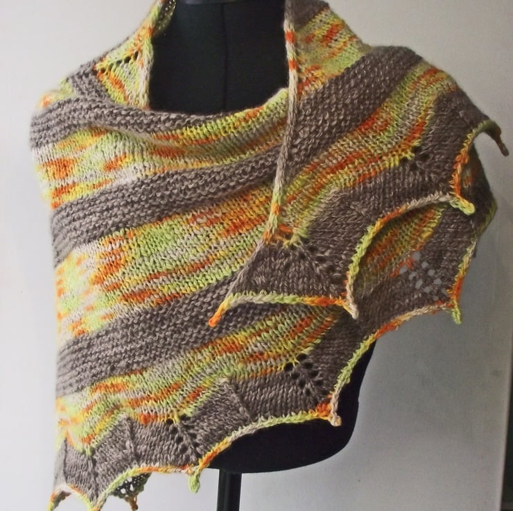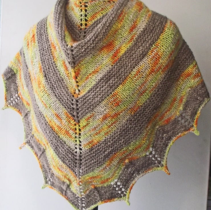 I handspun some beautifully soft British Bluefaced Leicester wool into a medium (DK) weight yarn. I then dyed some of this yarn a slightly variegated medium brown and the rest in variegated shades of gold, green, orange and beige. I then I knitted this triangular shawl.