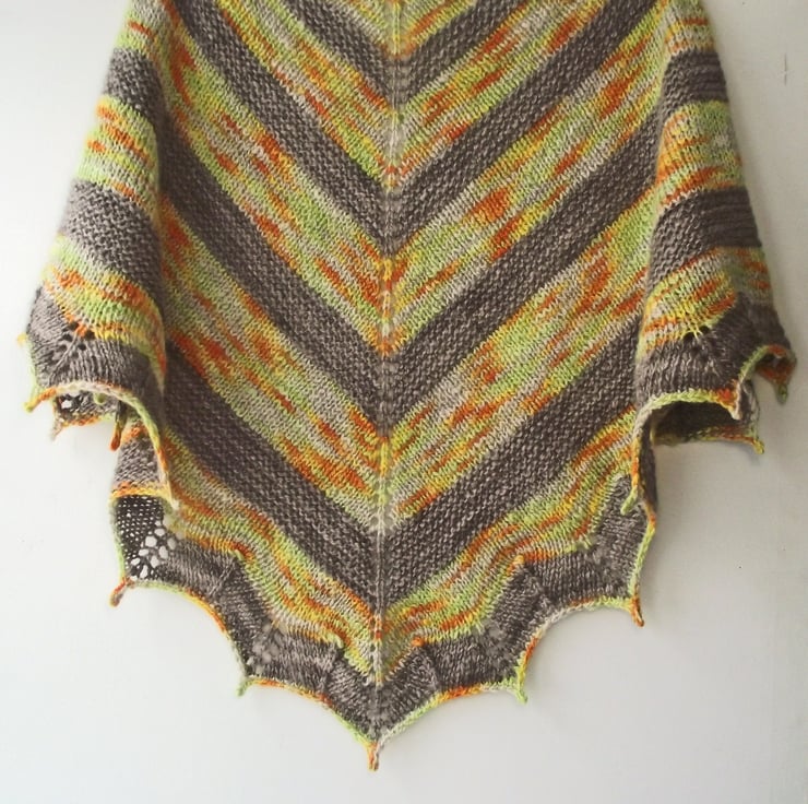 I used garter stitch for the brown sections and stocking stitch for the variegated sections, adding a chevron bottom border in the brown with little picots to accentuate the points.