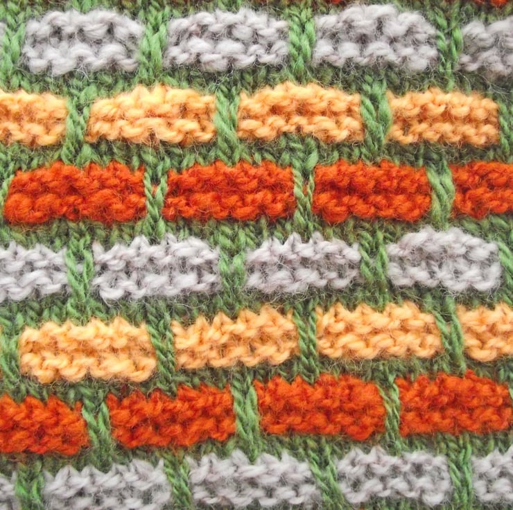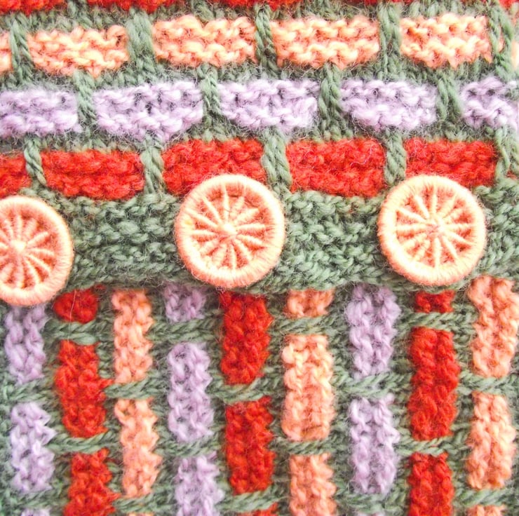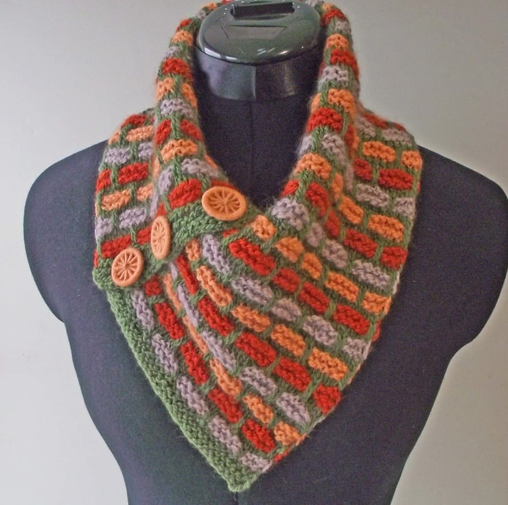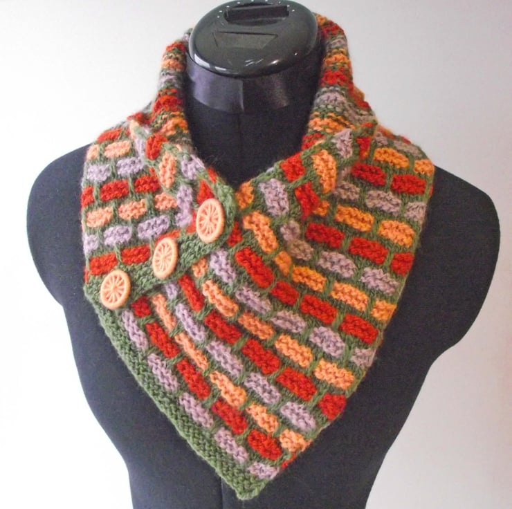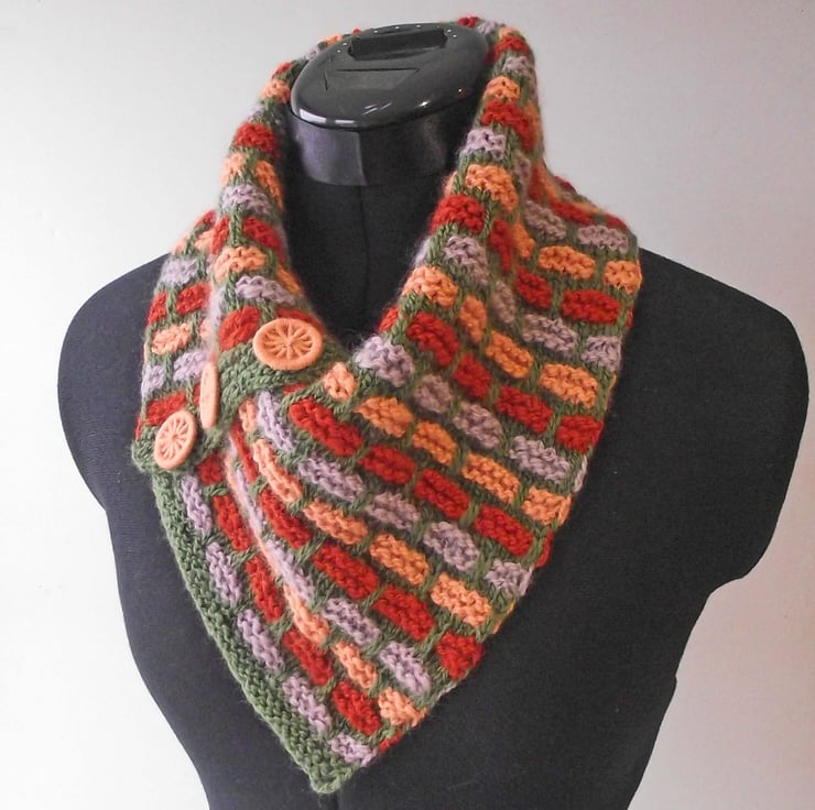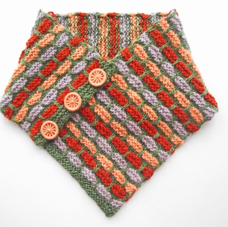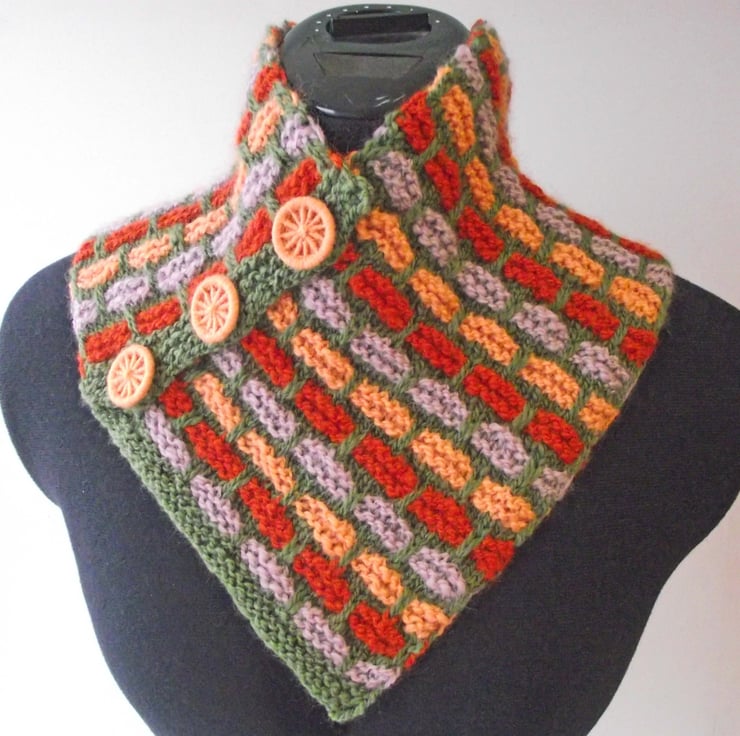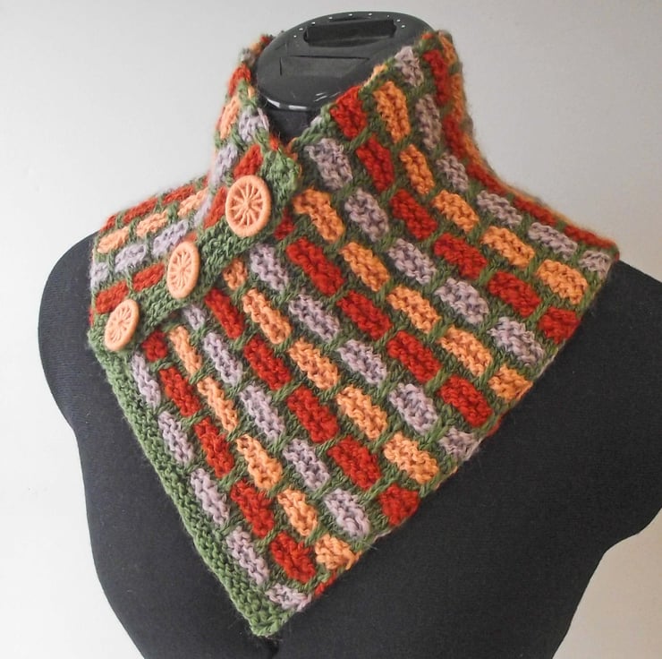 I handspun pure merino wool in four colours into medium weight yarns for this neckwarmer, cowl or dickie. The main colour is a mid green, with contrasting peach, fawn and rust. I then knitted this neck warmer, scarf or cowl in textured brick stitch. I added three handmade Dorset buttons in the peach yarn, woven around hollow brass rings. Dorset button making is an old traditional craft which is enjoying a revival using modern materials.