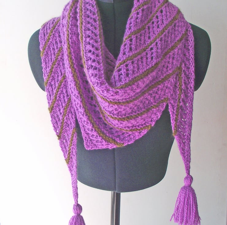 I then knitted this shawl or scarf, striping these two yarns using garter stitch and lacy trellis stitch. I added two tassels which give weight to the two ends.
