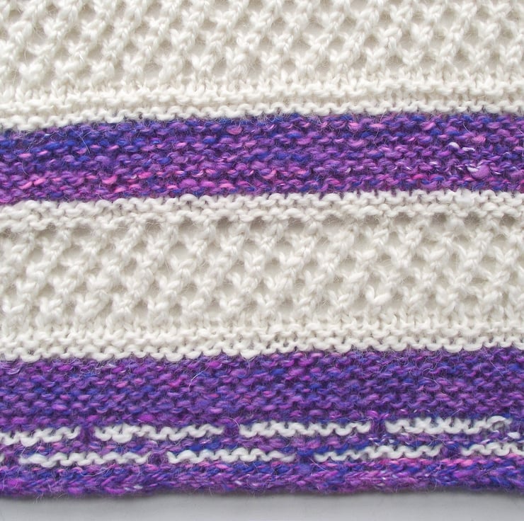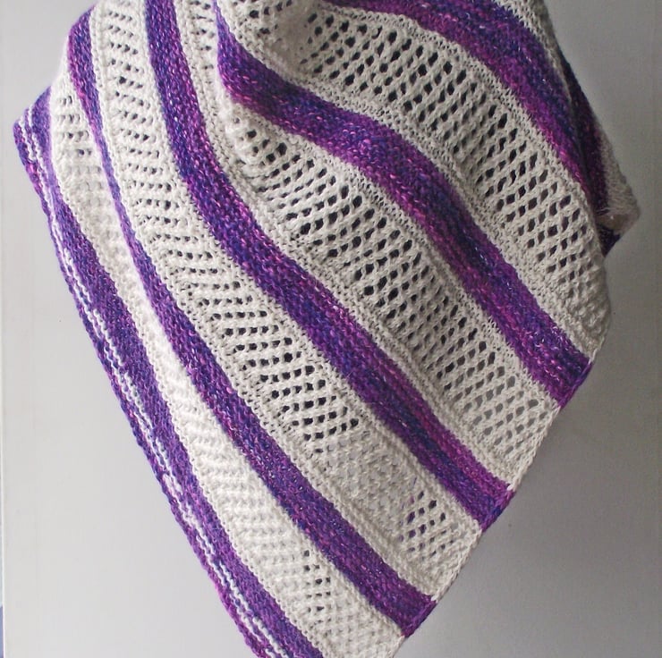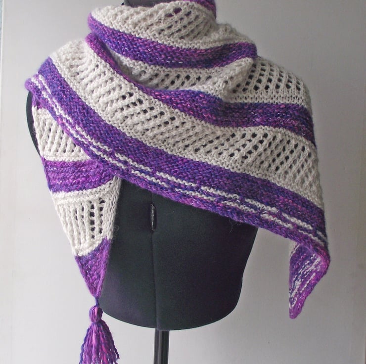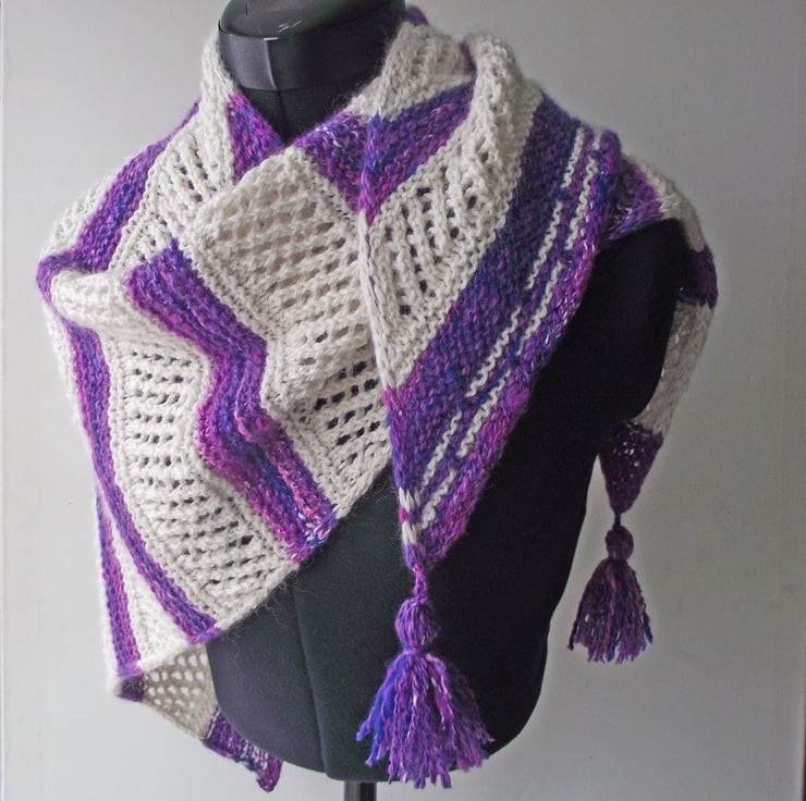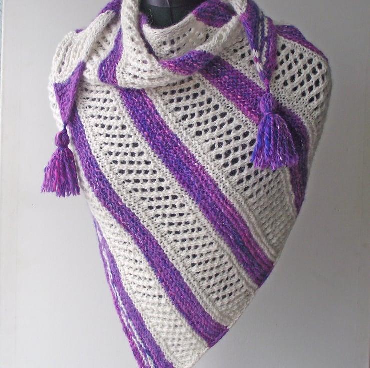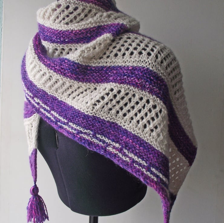 I handspun some beautifully soft merino wool blended with silk in natural white. I also blended several shades of purple and pink merino wool with a little silk and spun this blend into an interesting 'art yarn'. I then knitted this asymmetrical shawl, wrap or scarf in alternating bands of garter stitch and lacy lattice stitch striping the contrasting colours. I added tassels to two of the points which add weight, helping the ends to stay in place.