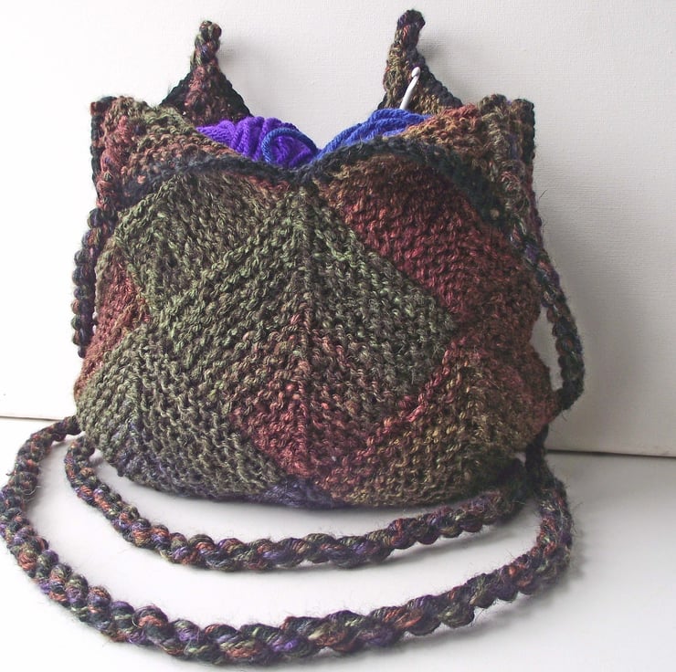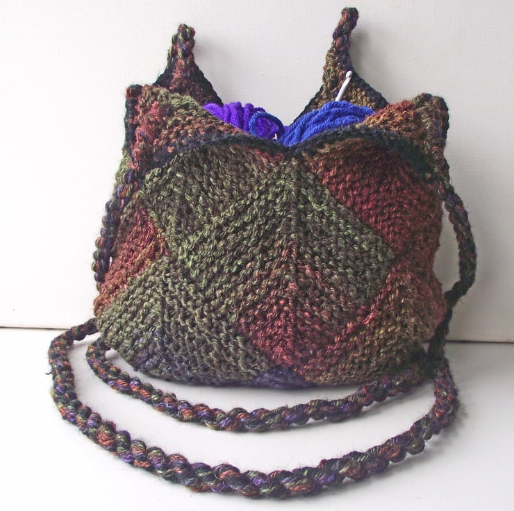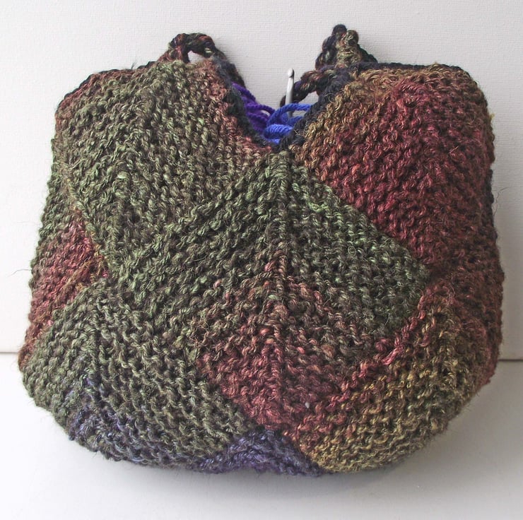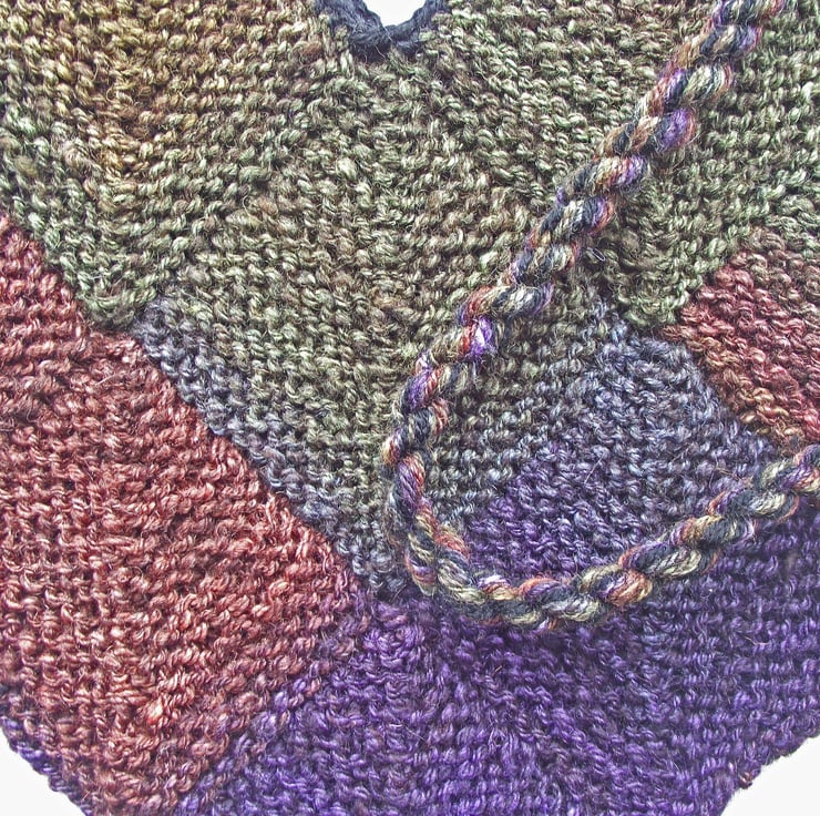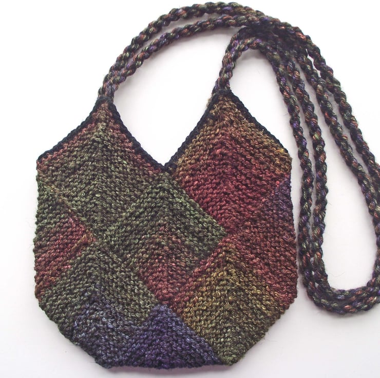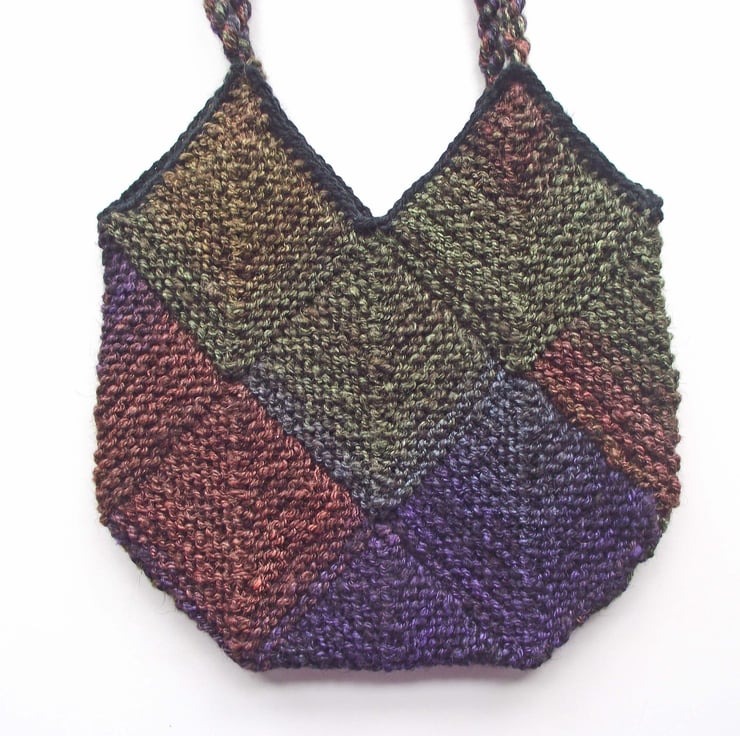 This shoulder bag was knitted using a modular technique with my own handspun variegated green, red and purple corriedale wool blended with silk, edged with black. The silk adds a lovely sheen and colour to the dark brown corriedale wool