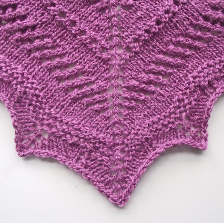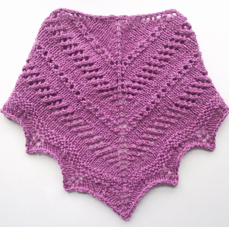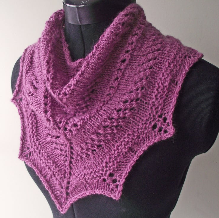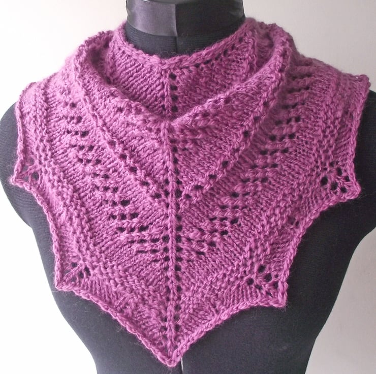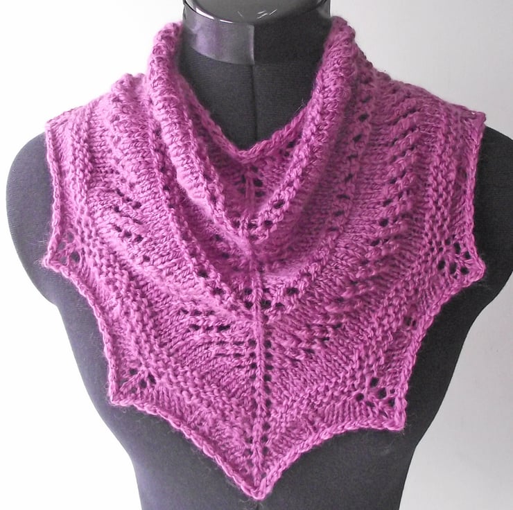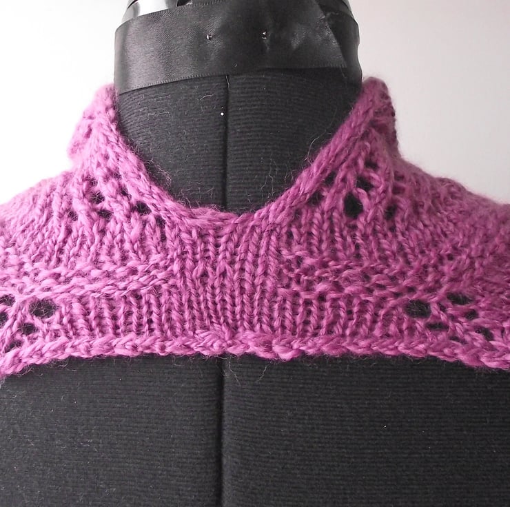 I handspun some beautifully soft merino wool into a lightweight yarn, then I knitted this neckwarmer, bandana or 'kerchief cowl' to my own design, with sections of lattice stitch, eyelets, smooth stocking stitch, edged with pointy picots. The colour is a deep pink with a hint of lilac.