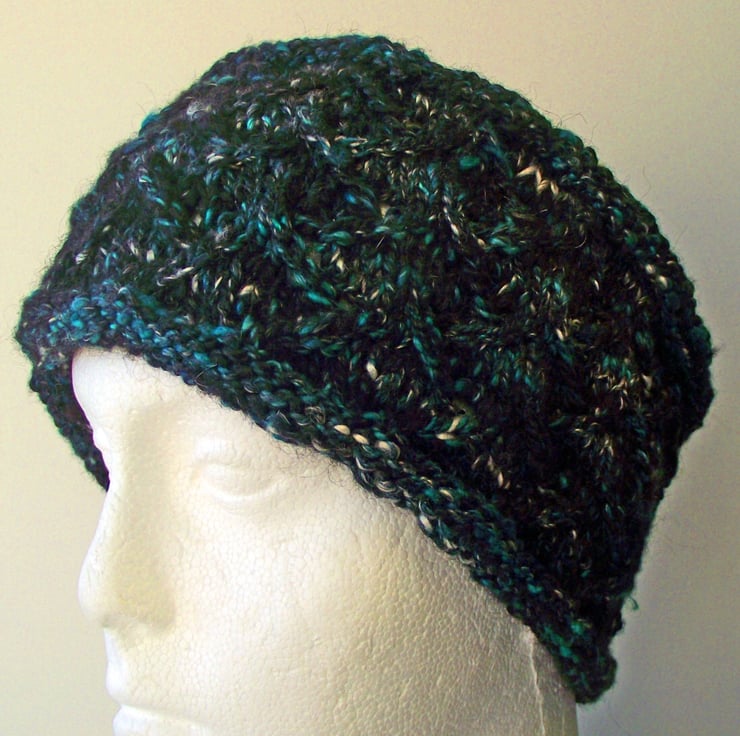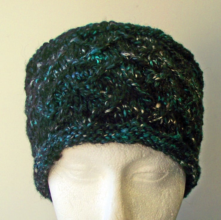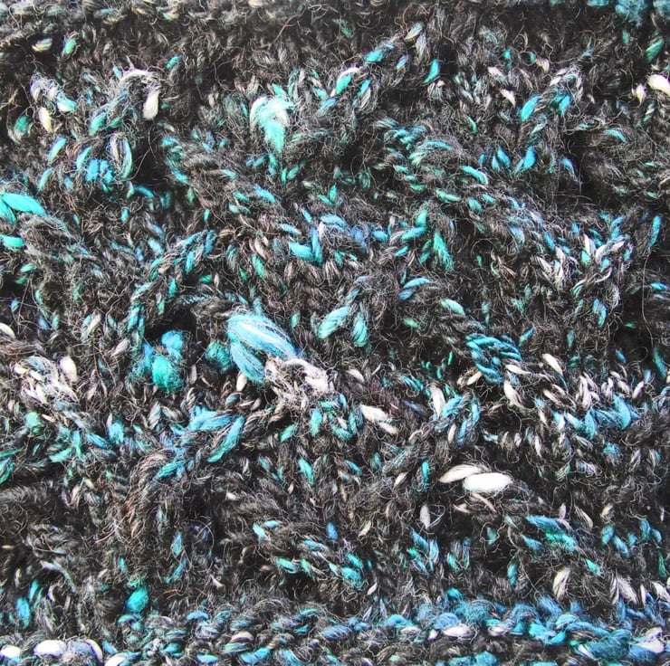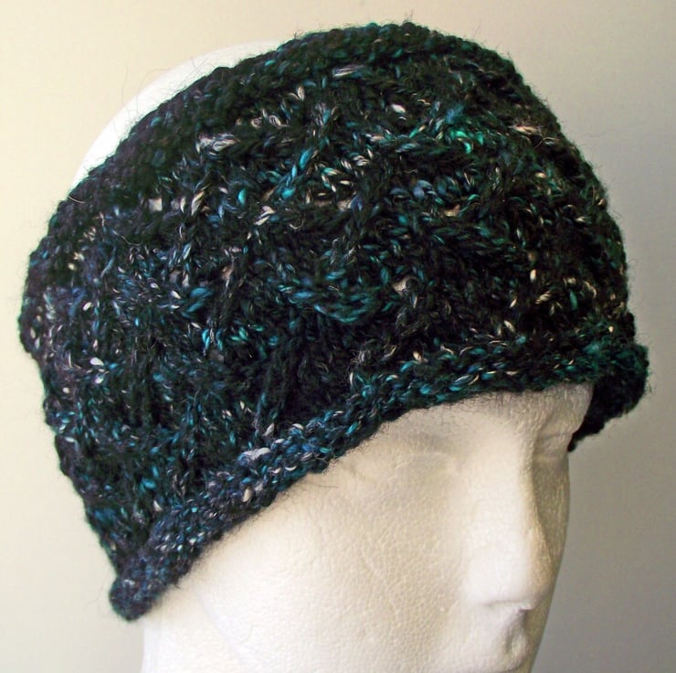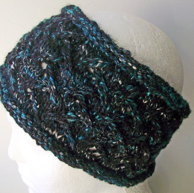 I blended some high quality black alpaca fibre with some dyed silk in greens and blues and some shiny white bamboo fibre. Then I handspun all these fibres on one of my spinning wheels into a textured designer yarn. I then knitted this wide hairband, headband or earwarmer in a lattice stitch which gives a firm but stretchy fabric ideal for headbands. The edges gently roll under, giving a comfortable fit. All the fibres I used are high quality, soft, smooth and not itchy.