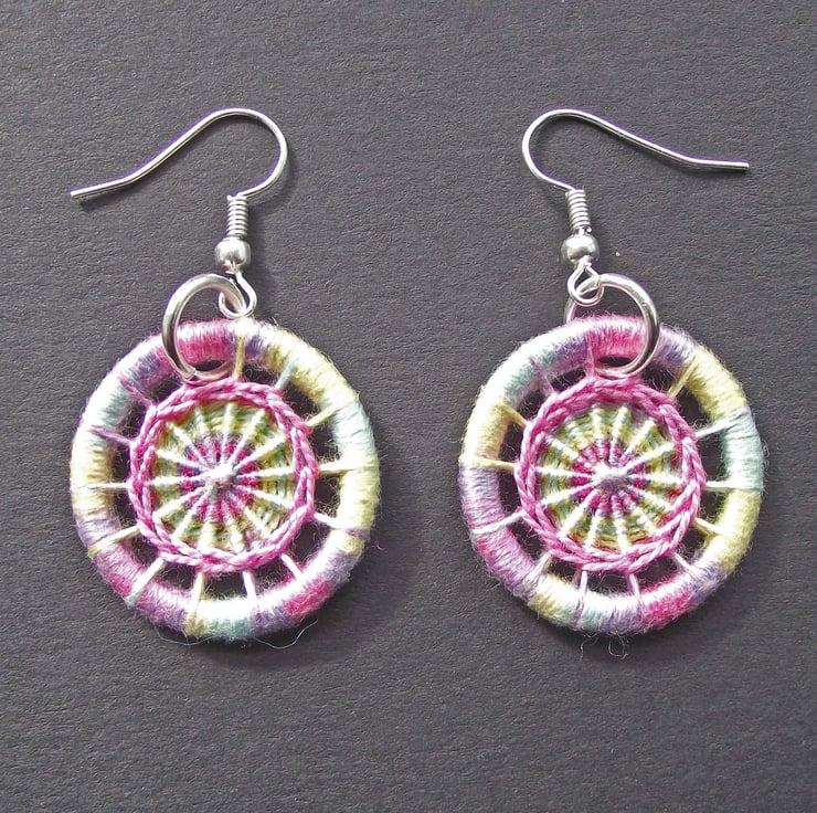 I made these earrings by making two Dorset buttons with variegated pastel rainbow cotton thread, solid pink cotton thread and hollow brass rings. As the rings are hollow, they are light in weight and comfortable to wear. I have added nickel-free, silver plated ear wires.