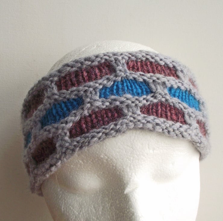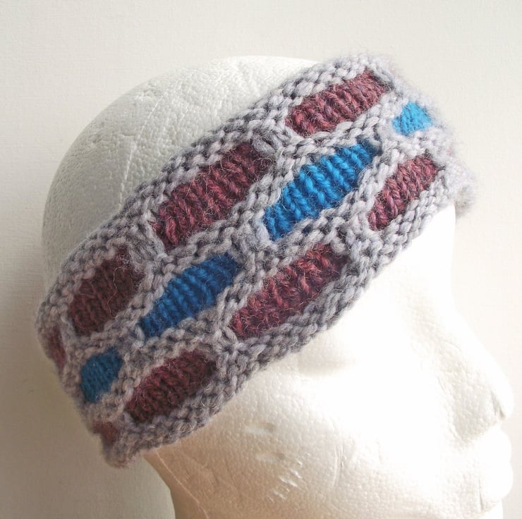 Knitted Headband, Earwarmer or Hairband, Handspun, Grey, Turquoise and Burgundy