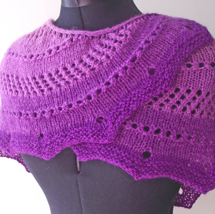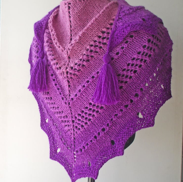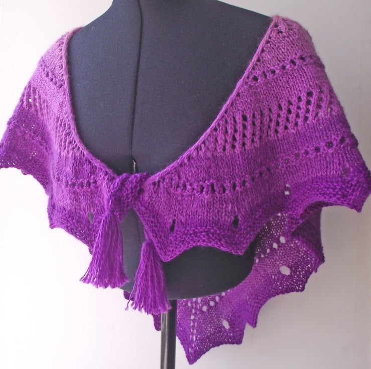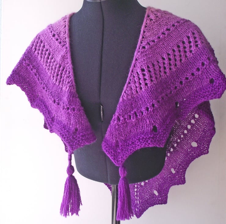 I then knitted this crescent shaped shawl or wrap. I added a pointy border and two generous tassels which add length and weight helping the ends to stay in place.