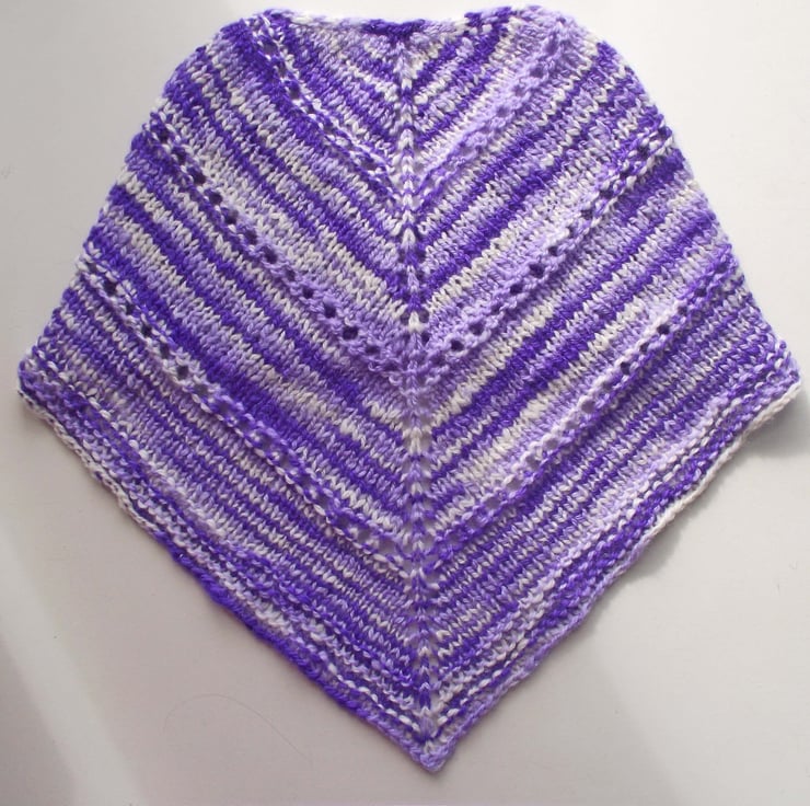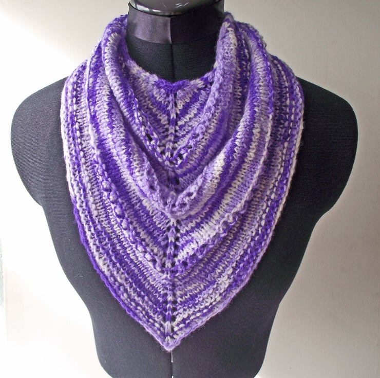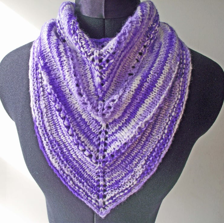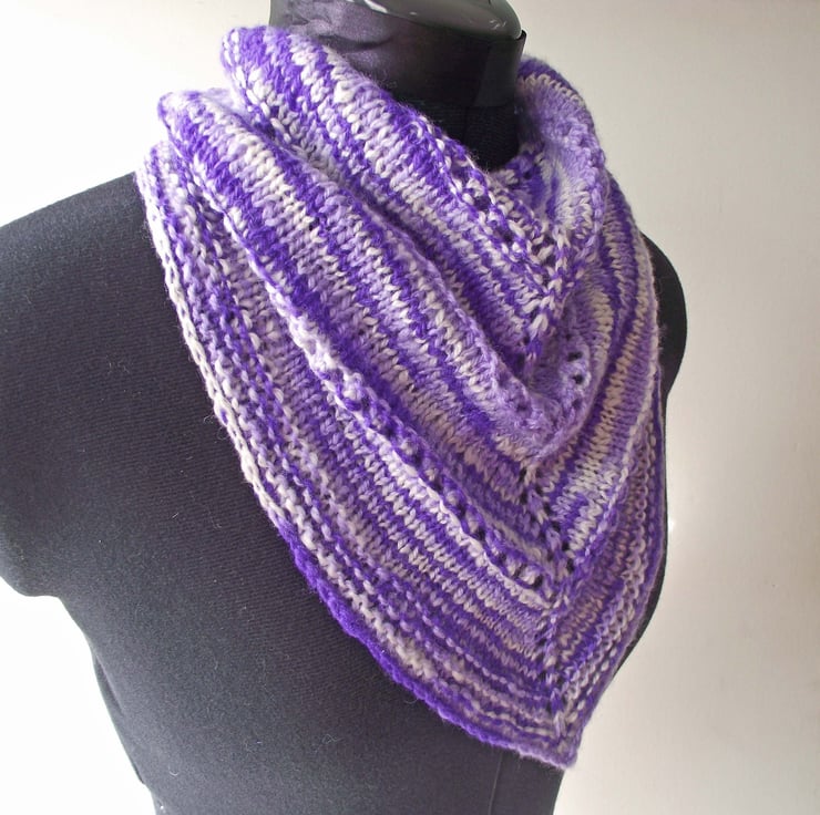 I handspun a lovely super soft blend of merino wool and silk into a fine yarn. I dyed the yarn in variegated shades of purple, lilac and white. I then knitted this cowl or neck warmer. I call it a kerchief cowl as it looks like a kerchief, neckerchief or triangular shawl, but it is joined at the back, so there is no uncomfortable bulk where ends would otherwise cross over.