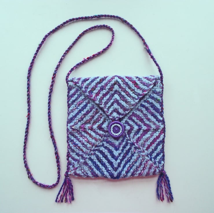This crossbody boho bag, or festival purse is truly unique. I used my own handspun merino wool yarns in pale blue and multi purple merino, shiny rose fibre and recycled sari silk to knit it. I then felted it, to add strength and minimise stretching. The bag is square with a flap.