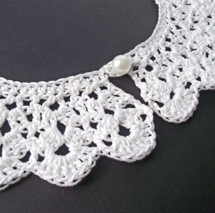 I crocheted this pretty lace collar in crisp white cotton thread, adding a loop and pearly button closure.
