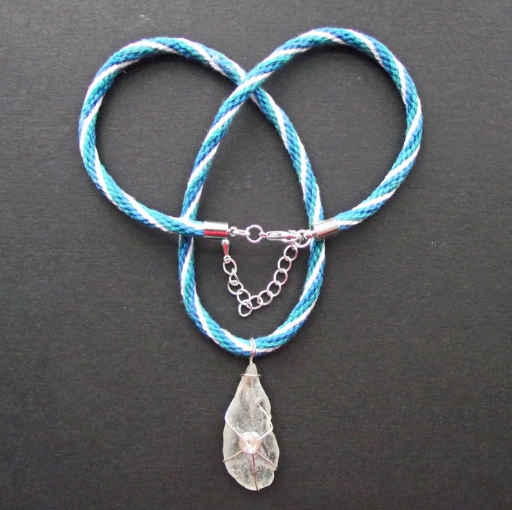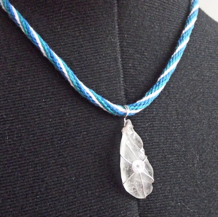 I then made a braid using blue, aqua and white cotton thread using the Japanese Kumihimo technique. I have used nickel-free silver plated jewellery findings to connect all the elements of the necklace, including an adjustable connection at the back.