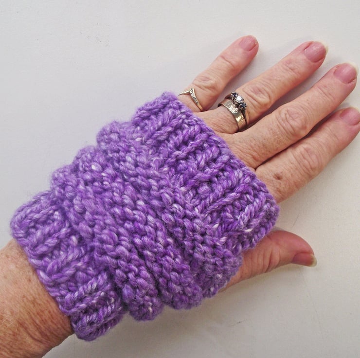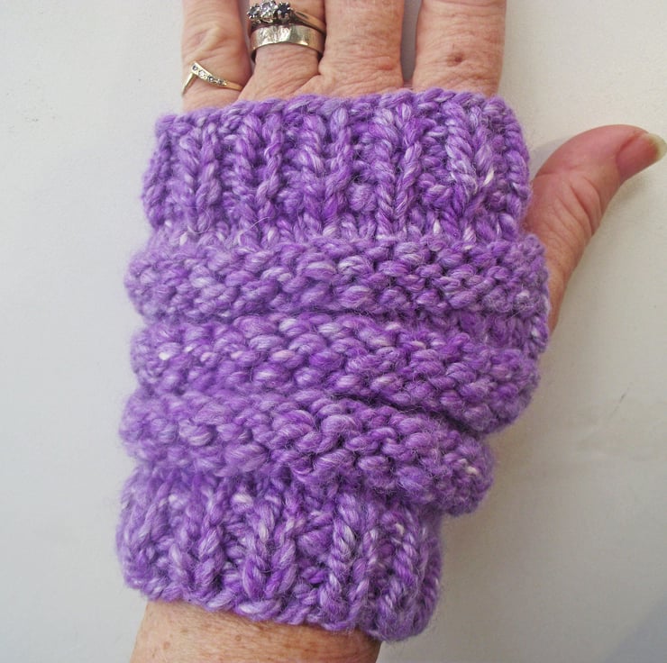These fingerless gloves are made from a lovely blend of lilac or light purple merino wool and silk yarn. I spun the high quality fibre into a thick yarn on my spinning wheel, then knitted these wristwarmers in bands of stocking stitch and garter stitch.