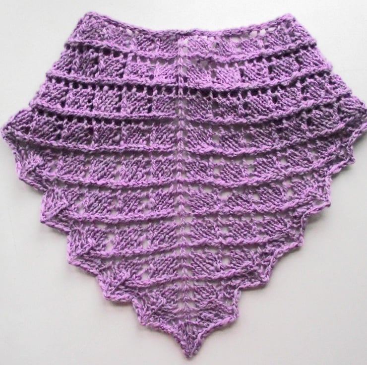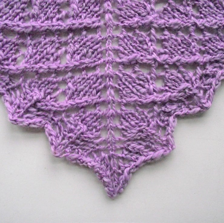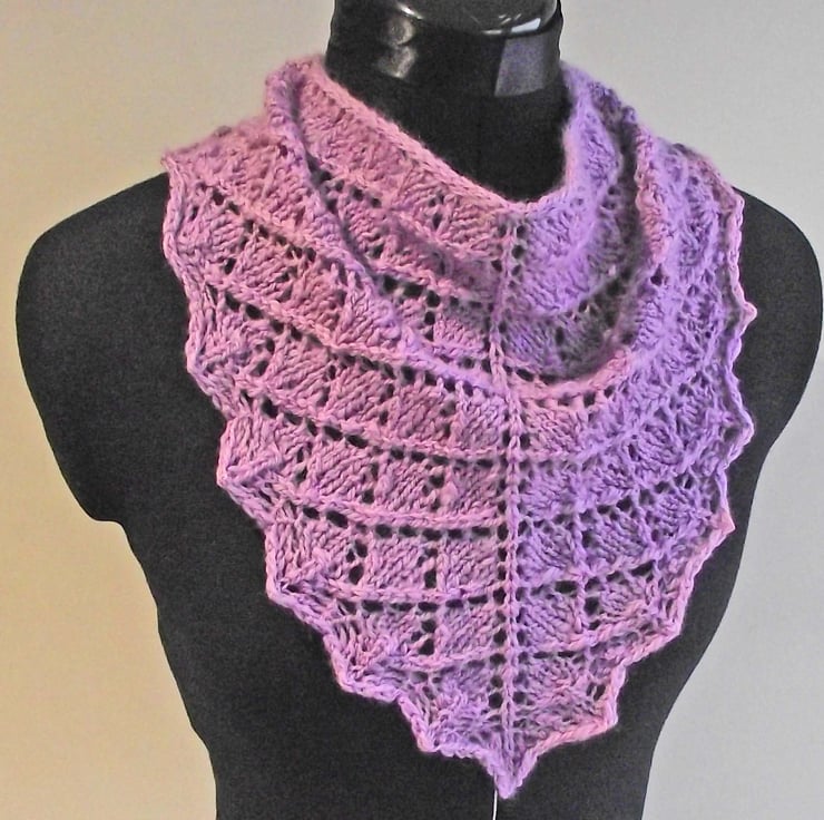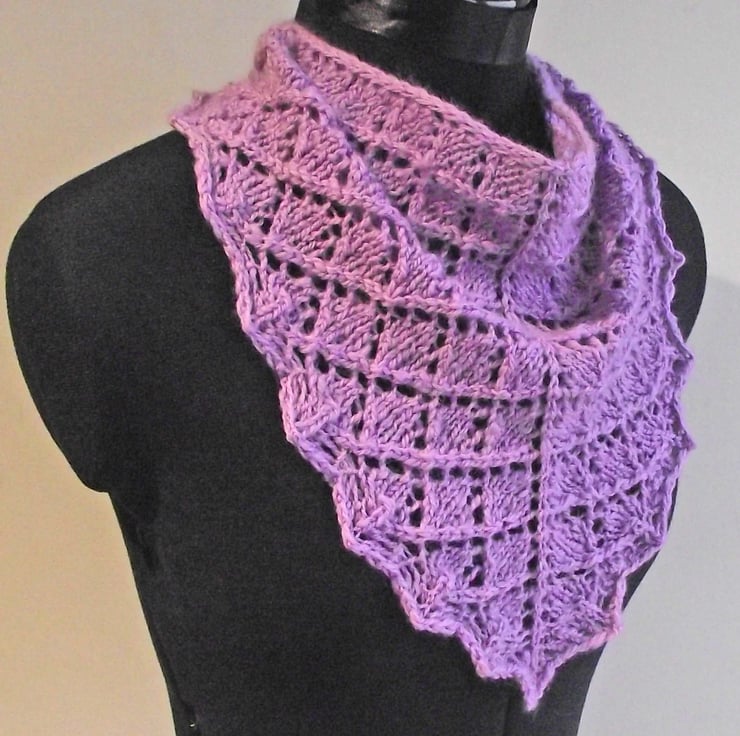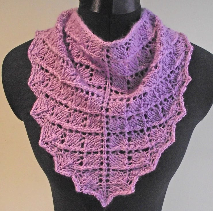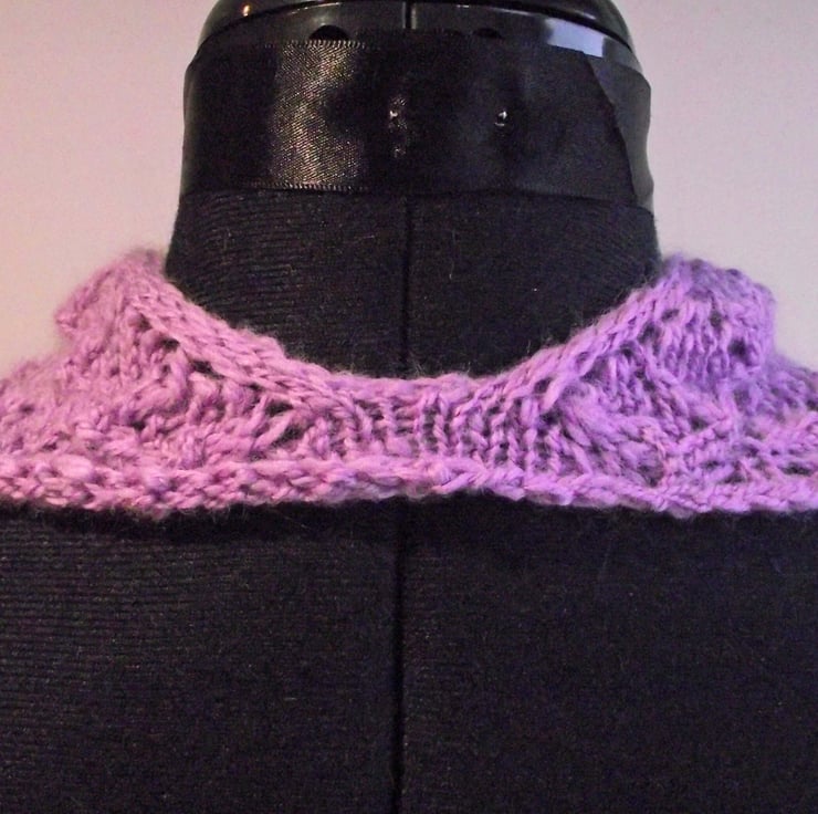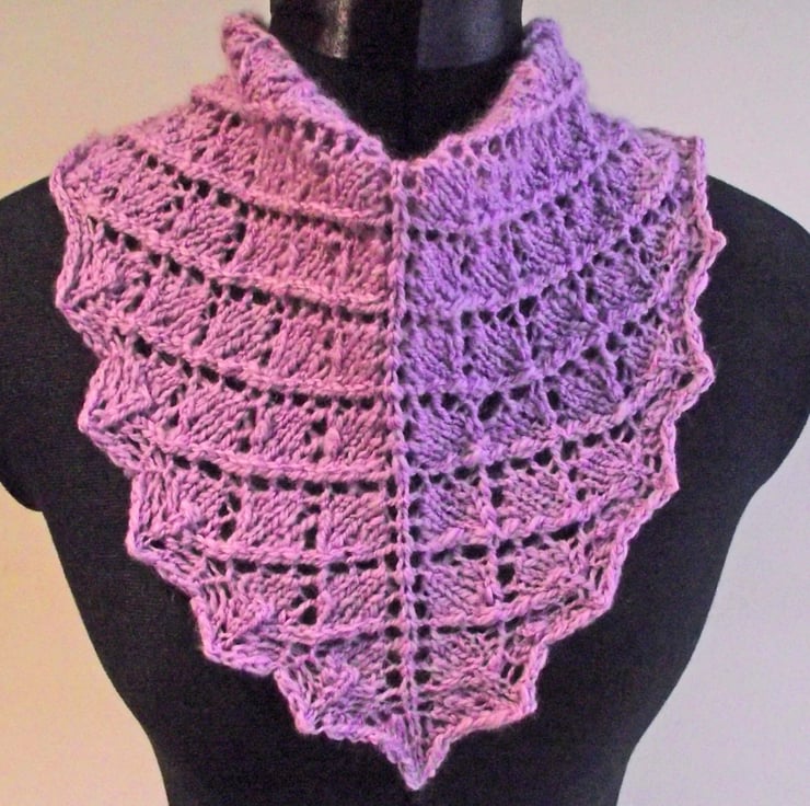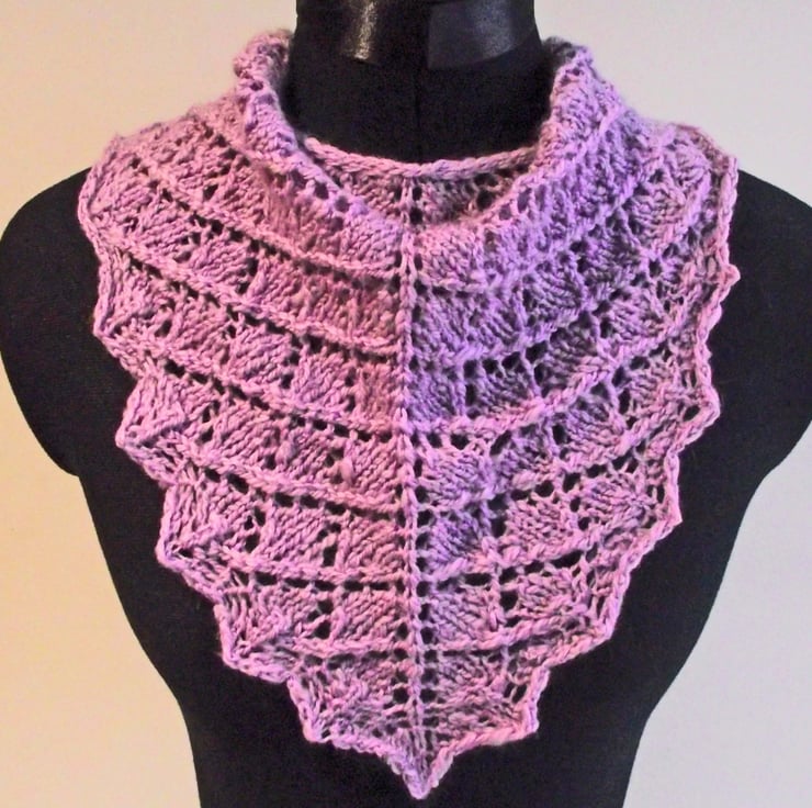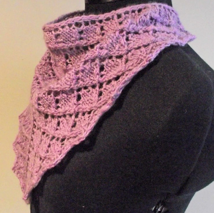 I handspun some super soft merino wool in a beautiful shade of lilac into a lightweight yarn. I then knitted this neckwarmer, bandana or 'kerchief cowl' to my own design. I thought this pretty colour called for a pretty lacy stitch, and it is finished off with a pointy edging.