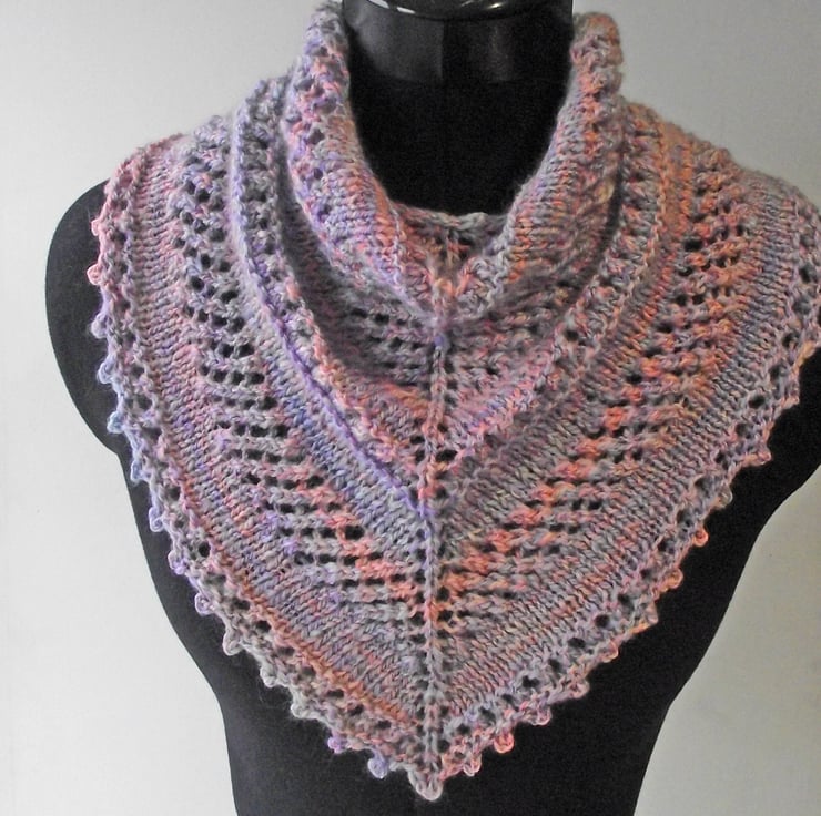 I handspun some soft merino wool, dyed in soft shades of lilac and peach, then I knitted this cowl or neckwarmer. I call it a kerchief cowl as it looks like a kerchief or neckerchief but it is joined at the back, so there is no uncomfortable bulk where ends would otherwise cross over.