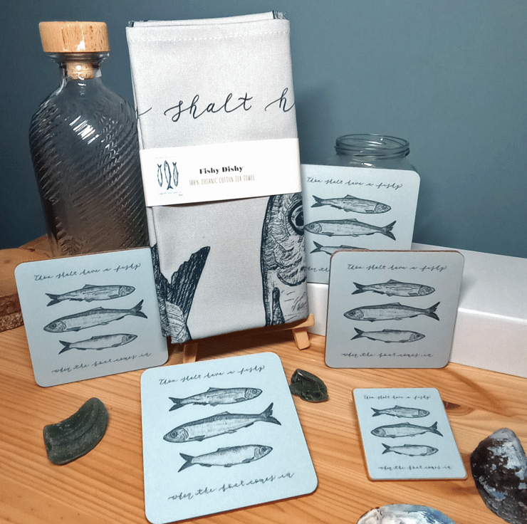 I was born and brought up in the North East and have always loved the traditional North East Folk Song 'Dance to your Daddy'. I wanted to create some artwork that celebrated the herring industry as having been historically a very important industry across the whole region and my Fishy Dishy design was born!