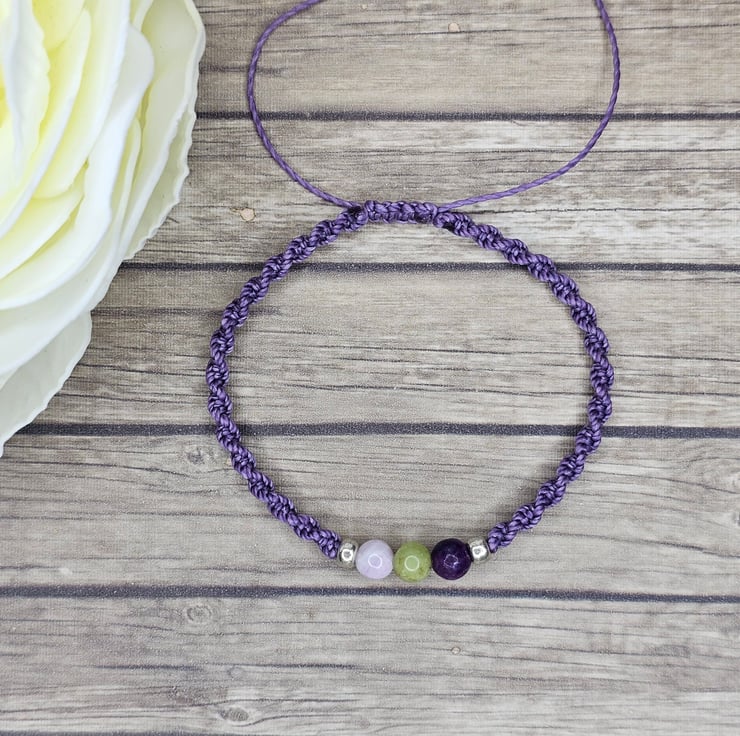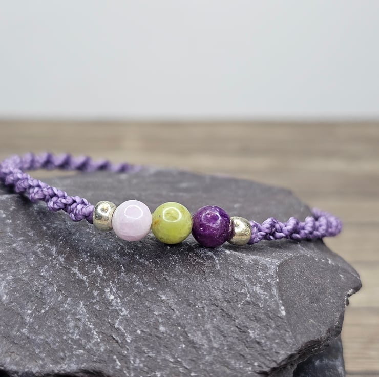 Strung on waxed Brazilian cord, made with Kunzite, Peridot and Lepidolite round beads (6mm).