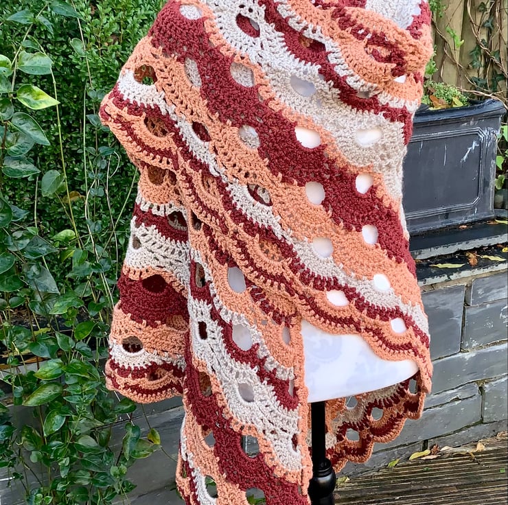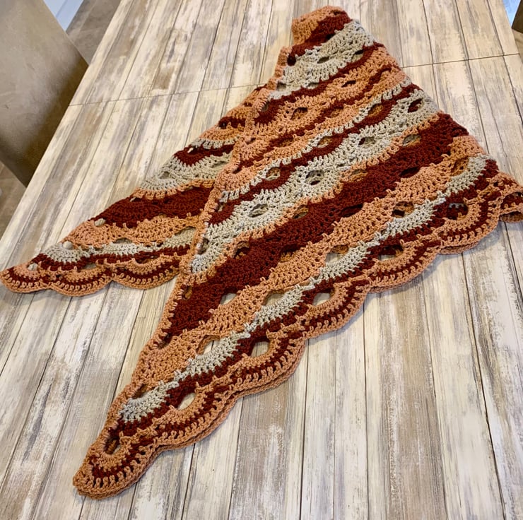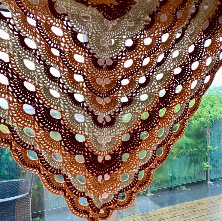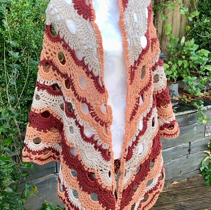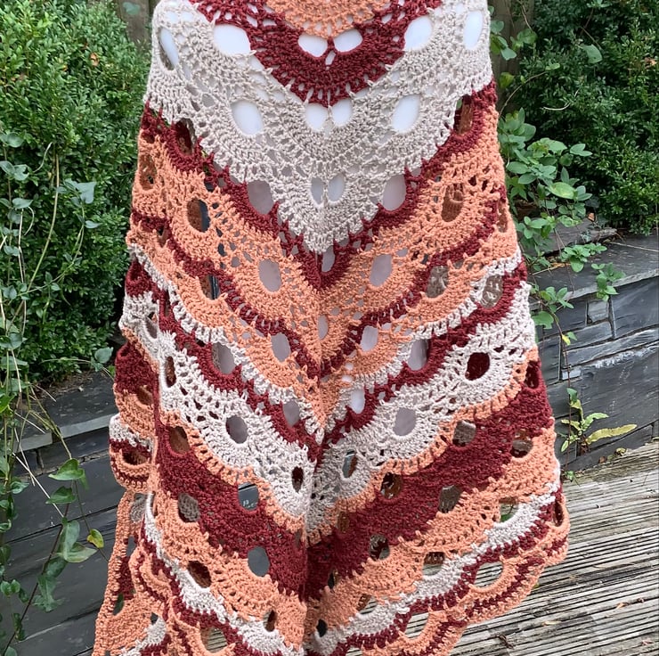 Handmade large shawl crocheted in "virus” design in autumnal shades of sand, terracotta and rust colours. Straight line upper edge with scalloped lower edge. Warm yet lightweight at 400g. Overall size is 220cm wingspan and 110 cm length. All my products are made in a smoke and pet free home too. Hand wash or machine wool setting, dry flat and don’t iron.