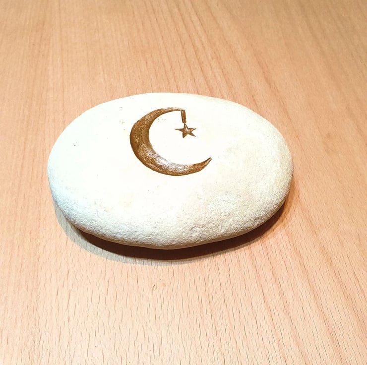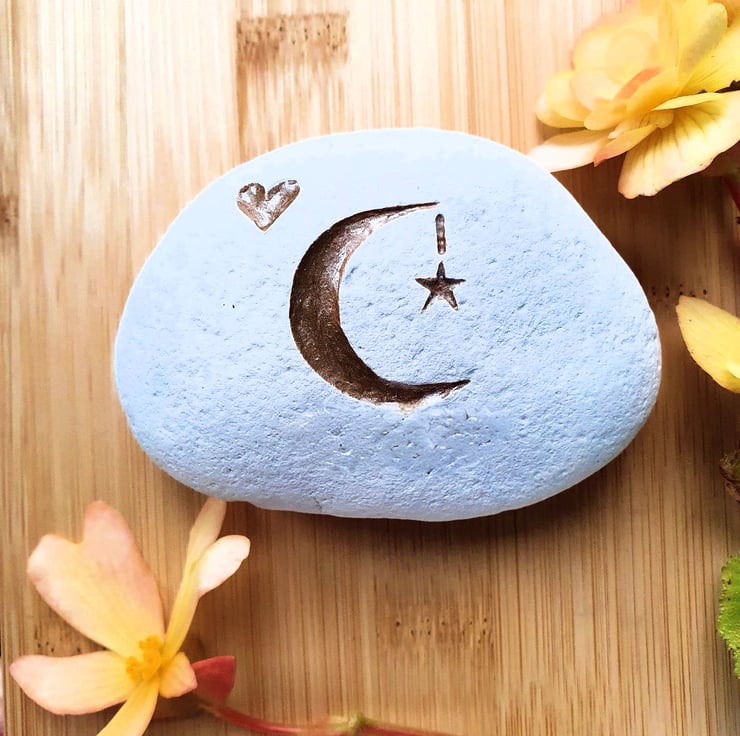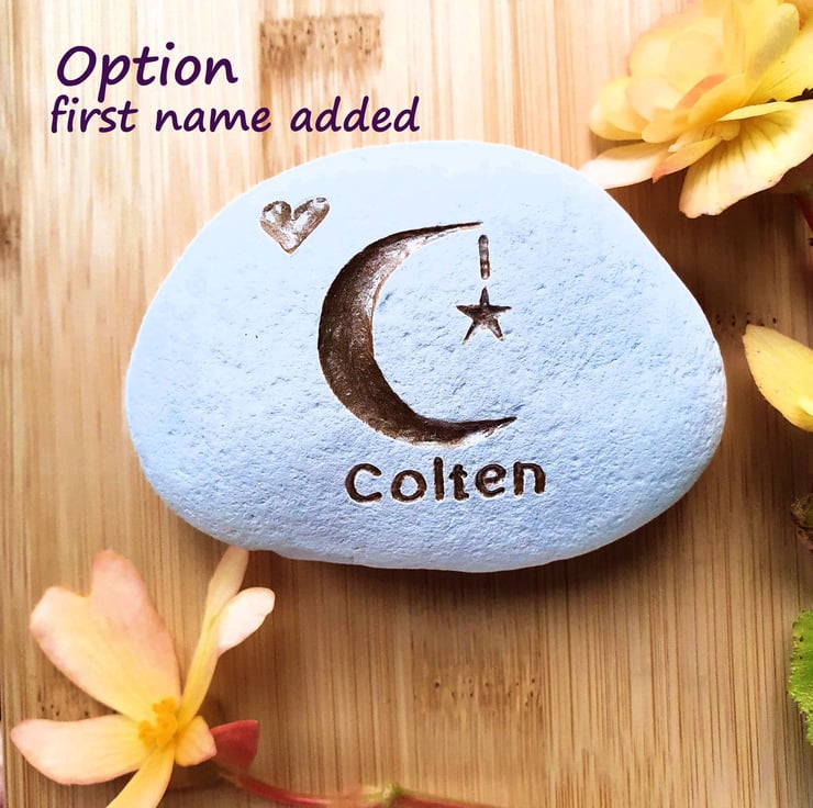 A thoughtful gift for as a memorial stone, grave marker or bereavement gift. This hand carved rock could also be given as a gift for Mother's Day, Father's Day, Birthdays or Christmas, to place in a favourite spot around the home or in the garden. You can choose to add a name and I will hand carve it onto the stone, just underneath the Heart, Moon & Star shape. This white stone could be sat on a planter or used as an ornament, paper weight or for general display on a bookcase, desk, mantelpiece or window cill etc.