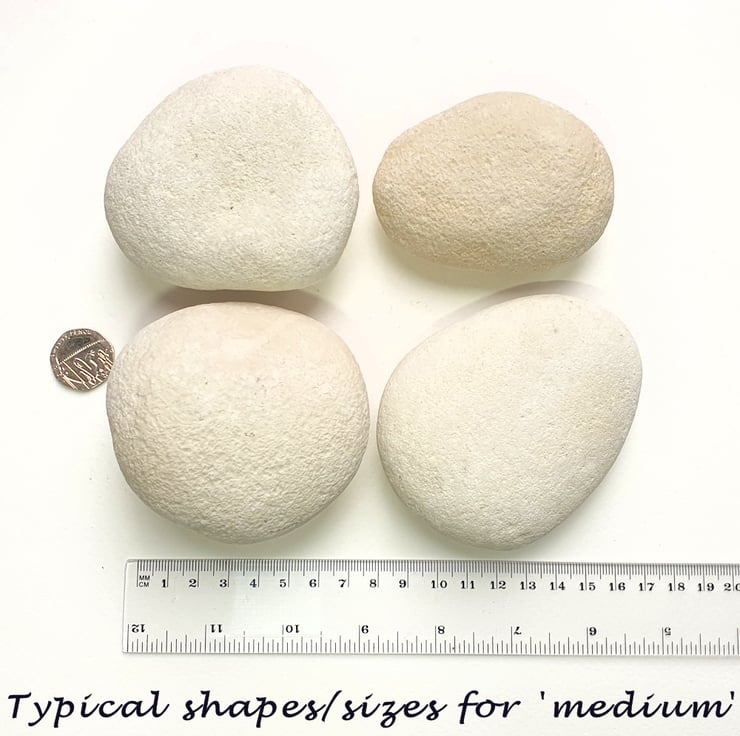 I use carefully selected white cobbles & stones, so sizes and particularly shapes vary from round to oval and fully rounded to quite flat. If you have a particular shape preference for your stone then please message when you place your order or with a note at the checkout, thanks.