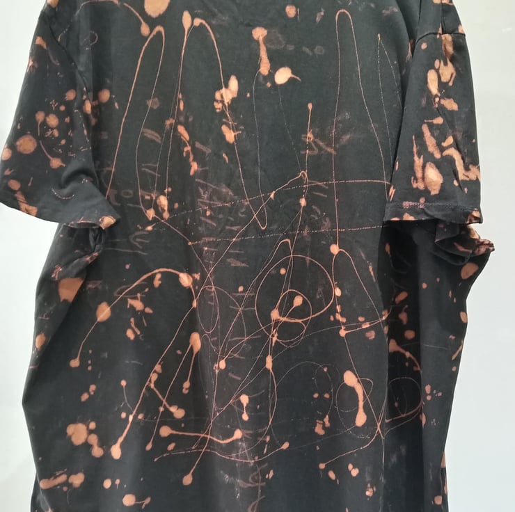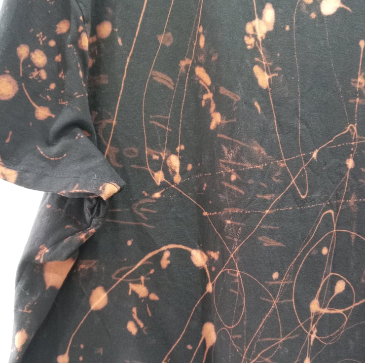 The patterns are all over the front, back and sleeves and they make the t-shirt a one of a kind. This has a grunge, worn, aged look about it. The process has left it a little out of shape (hence the price) but I think it adds to the overall look.