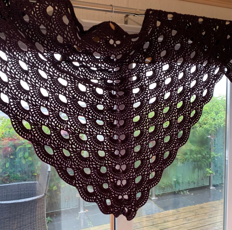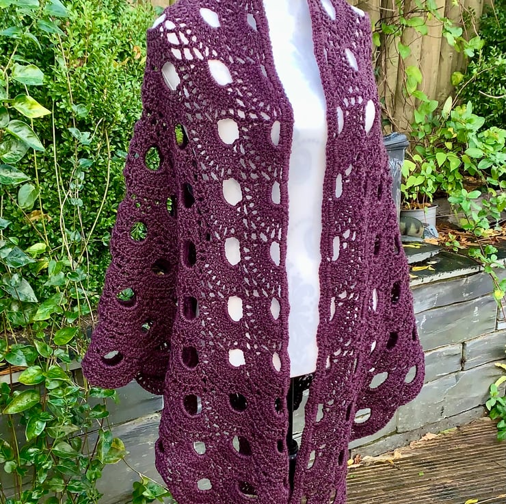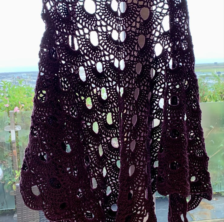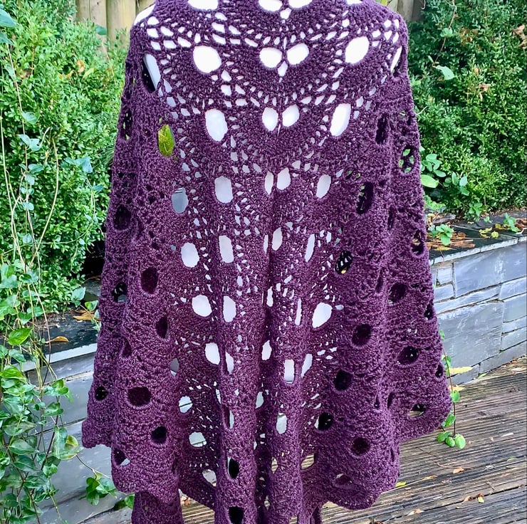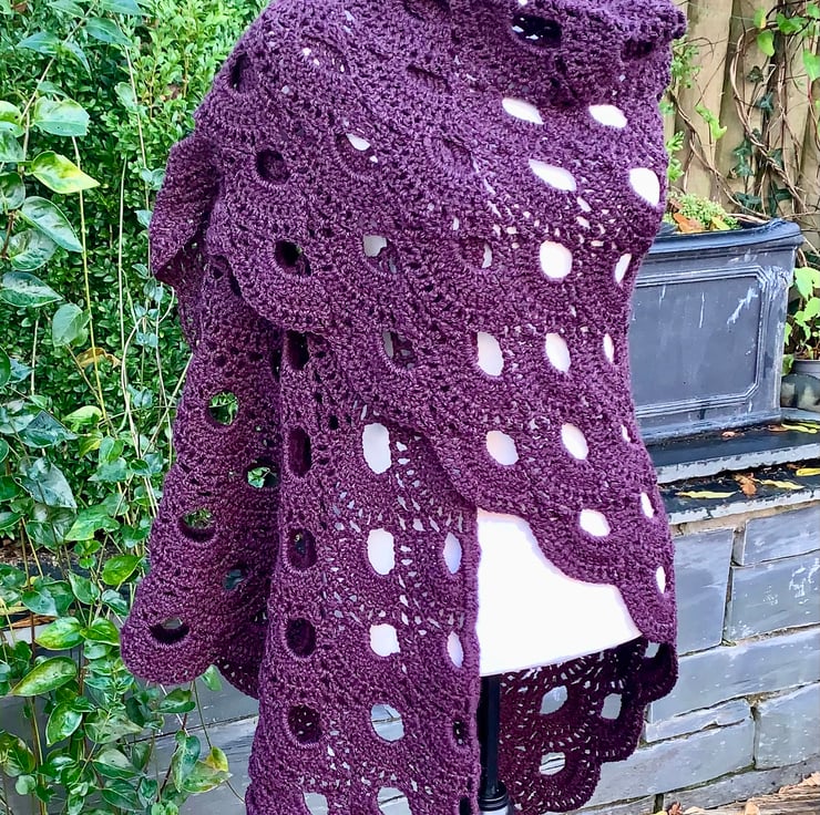 IHandmade large shawl crocheted in "virus” design in a rich plum colour, (colour slightly darker than pictures portray). Straight line upper edge with scalloped lower edge. Warm yet lightweight at 400g. Overall size is 220cm wingspan and 110cm length. All my products are made in a smoke and pet free home too. Hand wash or machine wool setting, dry flat and don’t iron.