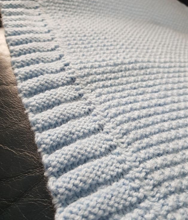 Simple, light, baby blanket, slip-garter stitch with garter/pleat edging. 47 x 62 cms.