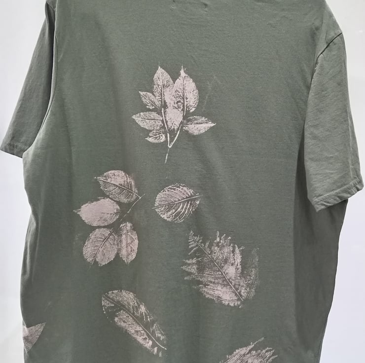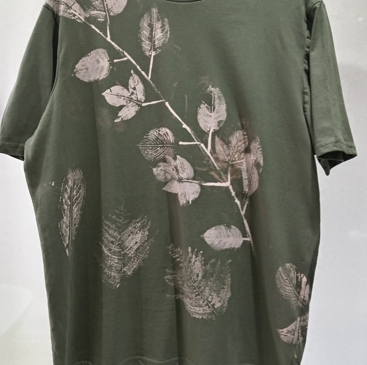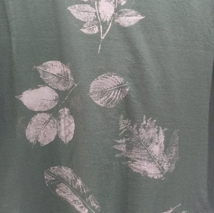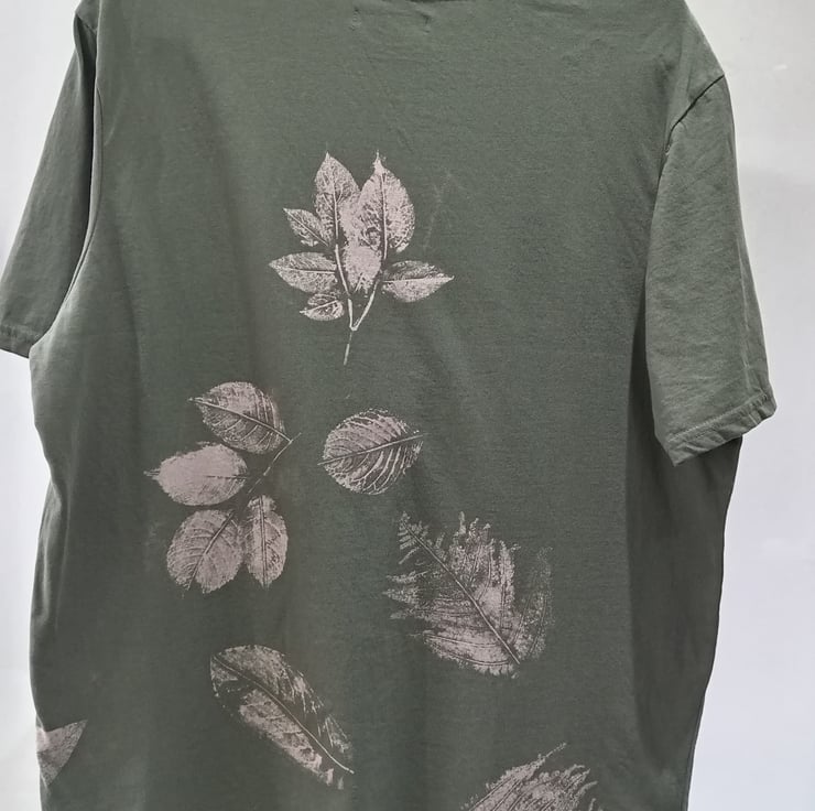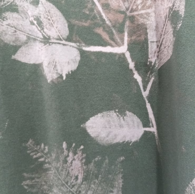 It has a reverse tie dye (bleached) finish with lots of detail created with leaves found on my walks.The bleached areas are in shades of beige with a hint of pink.