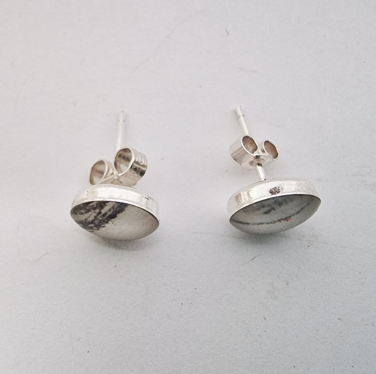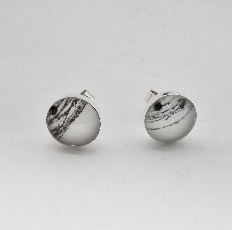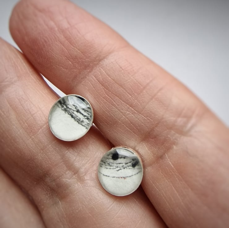 A beautiful pair of sterling silver stud earrings with resin encasing an original drawing.
