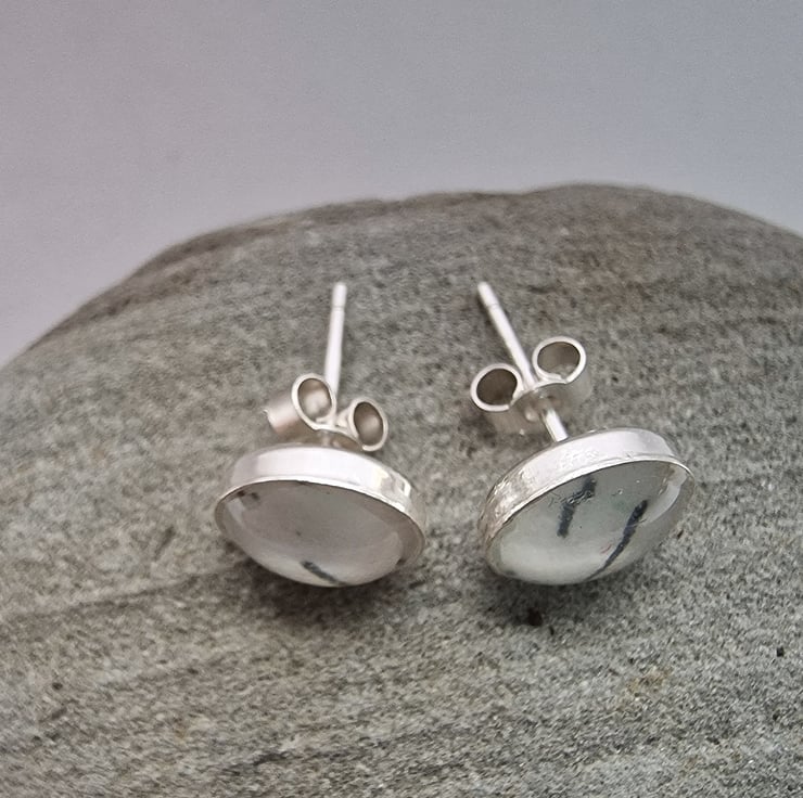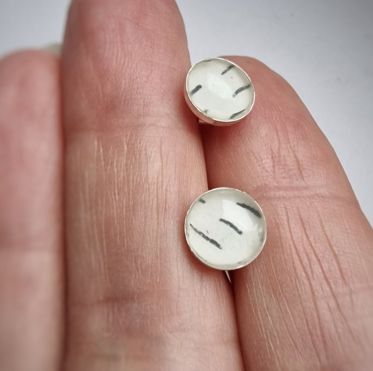 A beautiful pair of sterling silver stud earrings with resin encasing an original drawing.