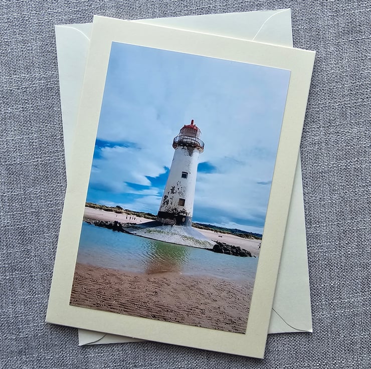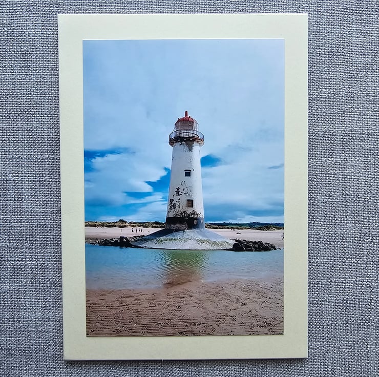 The card features one of my photos of the Point of Ayr lighthouse in Talacre, Flintshire (North Wales). It is one of my favourite places and I like to walk on the beach and in the nature reserve. The light is always changing so it is never exactly the same.