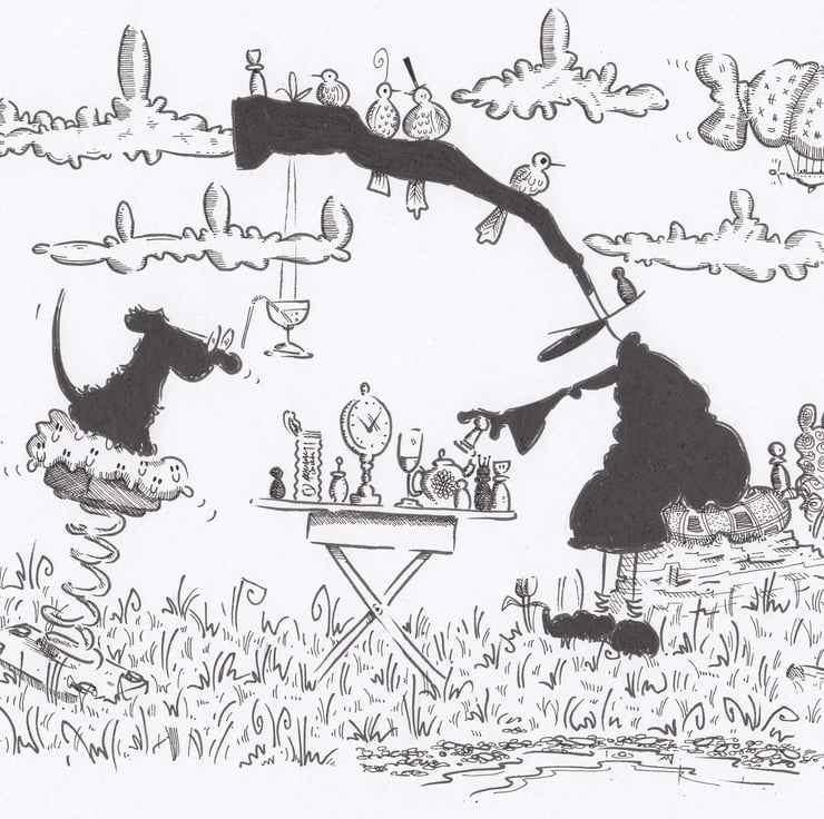 Neither of them have the slightest idea of what the rules are and anyway, Reg always cheats. It should also be noted that he only wears the glasses as an affectation. The birds look on in bewilderment.