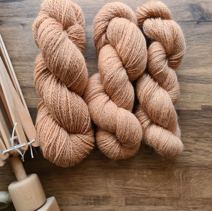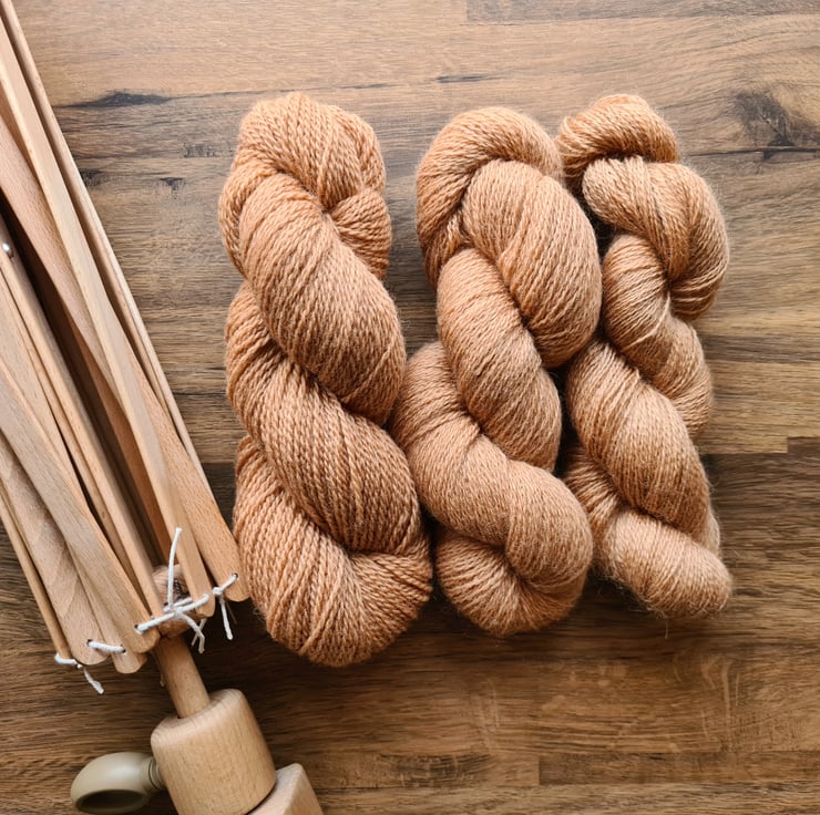 Rhubarb roots and an alkali modifier was used to create gorgeous tones of naturally dyed locally spun wool yarn. Perfect for stripes and colour work in knitting, crochet, embroidery and weaving projects!