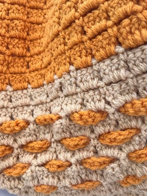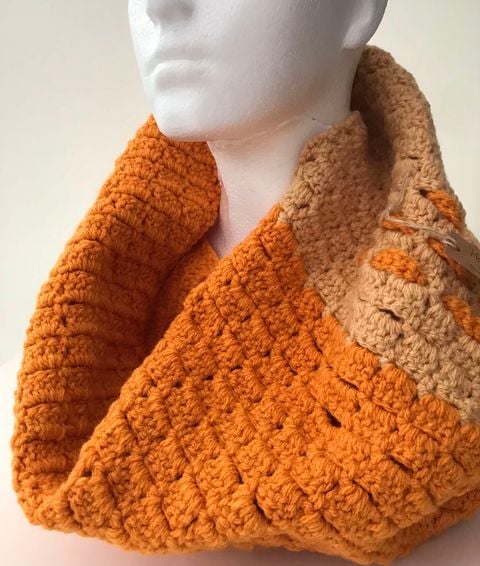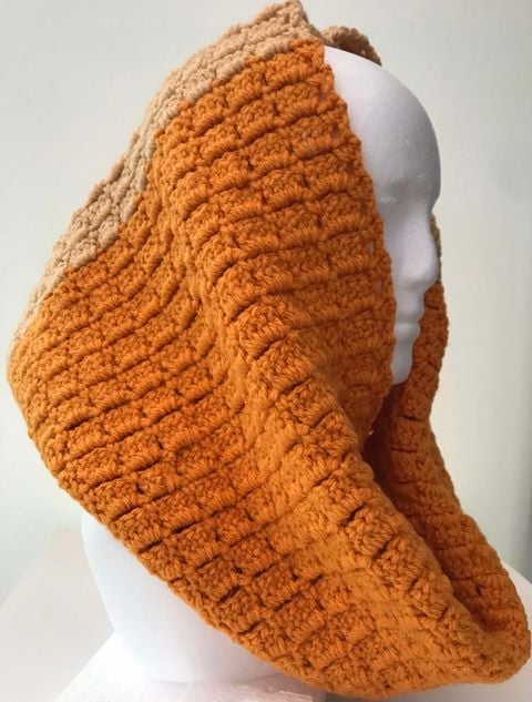 Hooded scarf in two colors, brick/burnt orange, and cream latte. It is decorated with an inserted orange crocheted lace (which can be carefully removed).