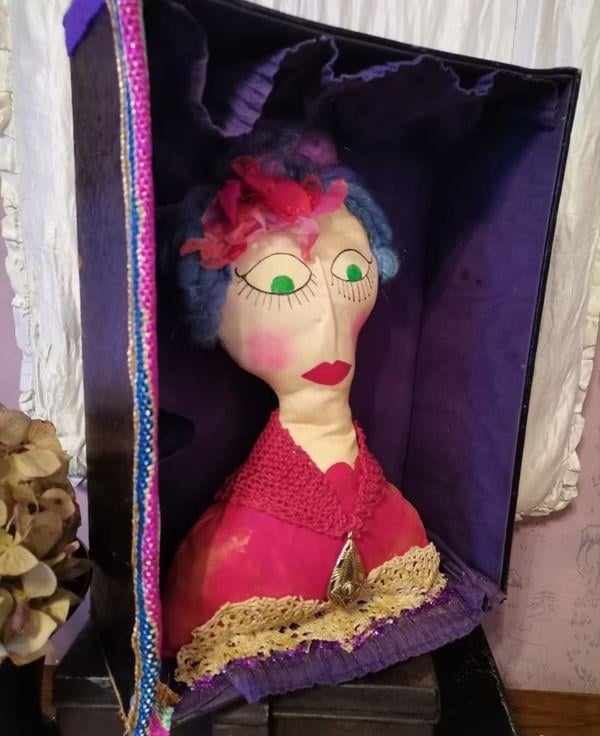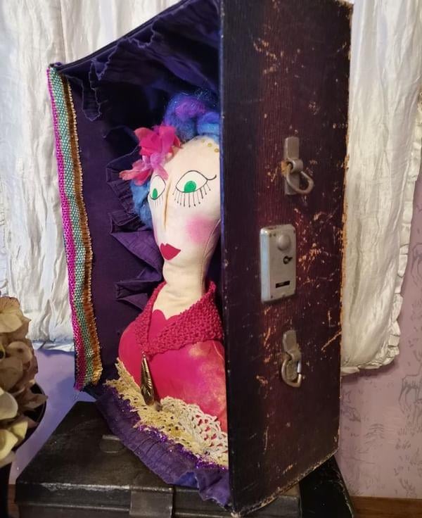With hand painted details and features, vintage fabric flowers and pink and purple hair.