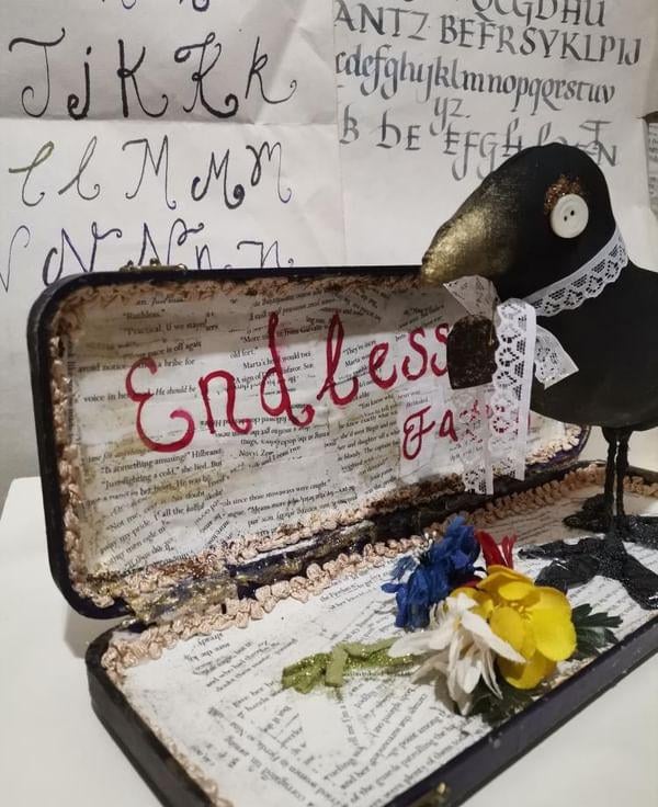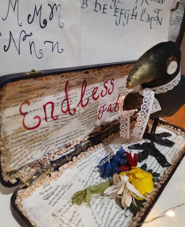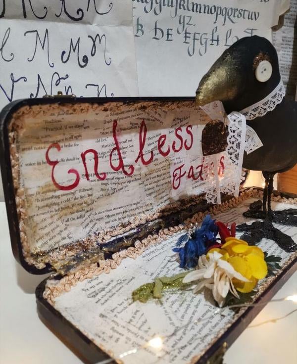 The whole piece is hand created in a vintage box which I lined with book pages, added gold painted details and painted