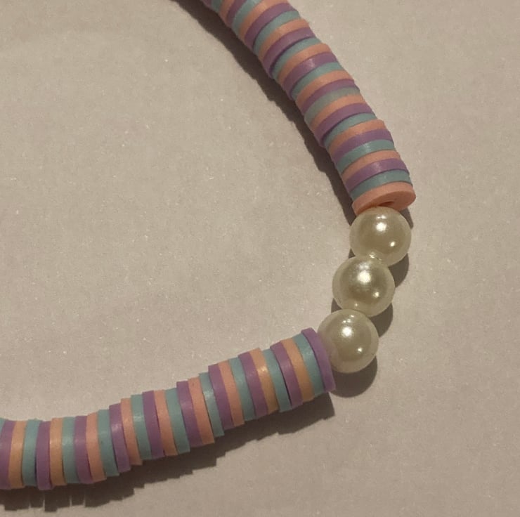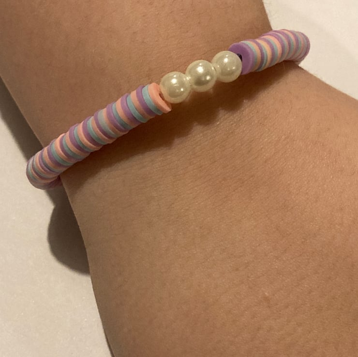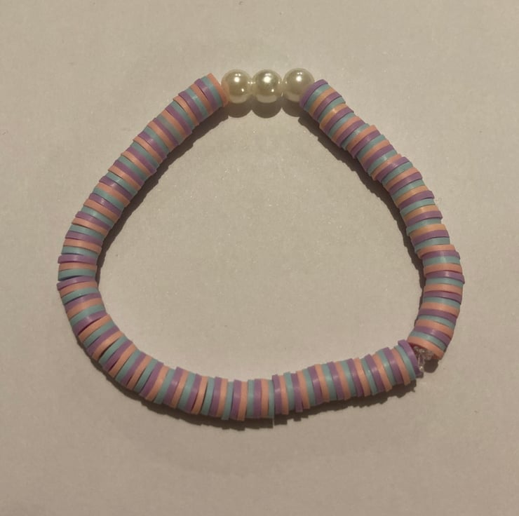 Cute and girlie pastel clay bead bracelet and finished off with three white beads.