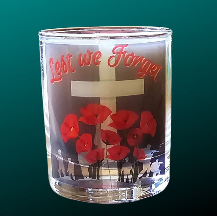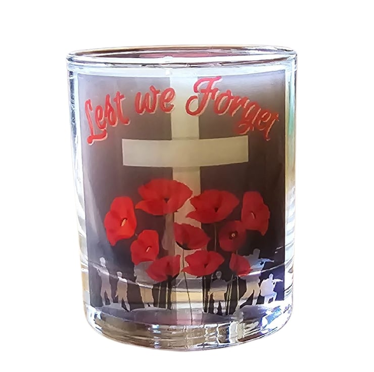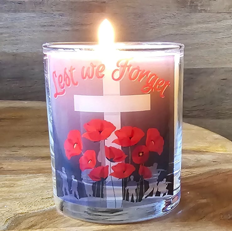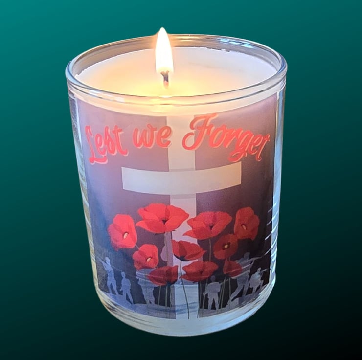 A scented candle for Remembrance with a Lest We Forget design on the glass container. For each candle sold a donation of £4 will be given to the Royal British Legion Poppy Appeal.